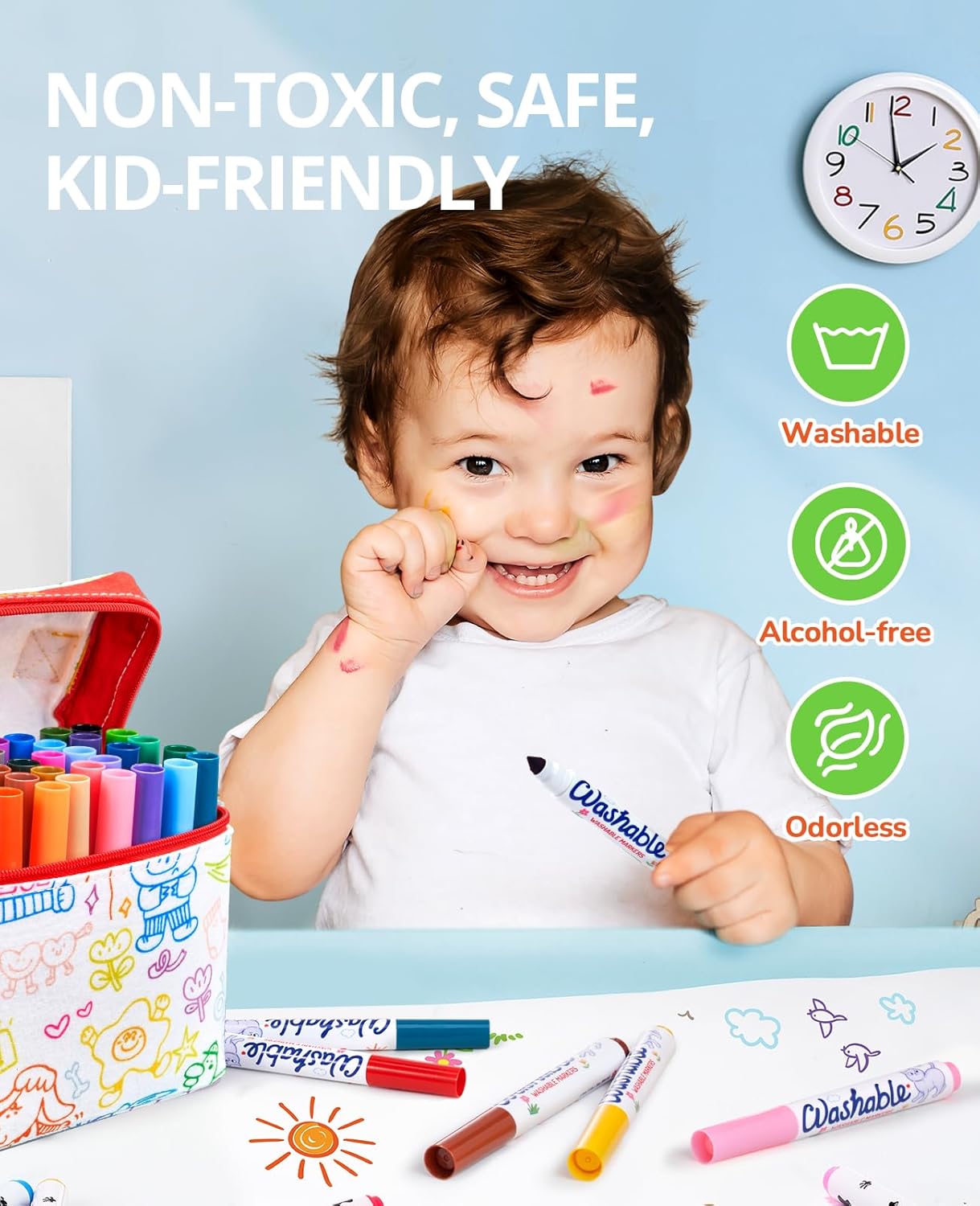 - 【NON-TOXIC & ULTRA WASHABLE】Certified non-toxic (meets ASTM-D4236) and safe for ages 3+. Stress-free clean-up! Ink washes off skin and most fabrics with water – no scrubbing needed! (Note: Not for whiteboards - may stain but wipes clean with a damp cloth)