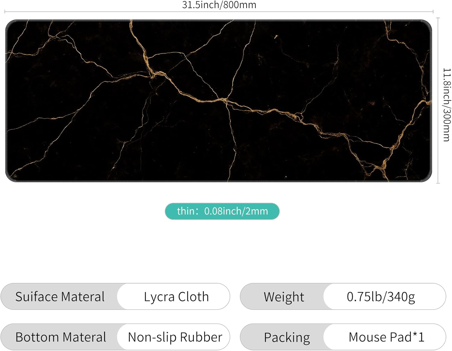 Dynippy Thin Extended Gaming Mouse Pad (31.5 * 11.8 * 0.08 inch) with Stitched Edges Large Mousepad Long XXL Keyboard and Mouse pad Desk Mat for Gaming Office & Home - Black Gold Marble