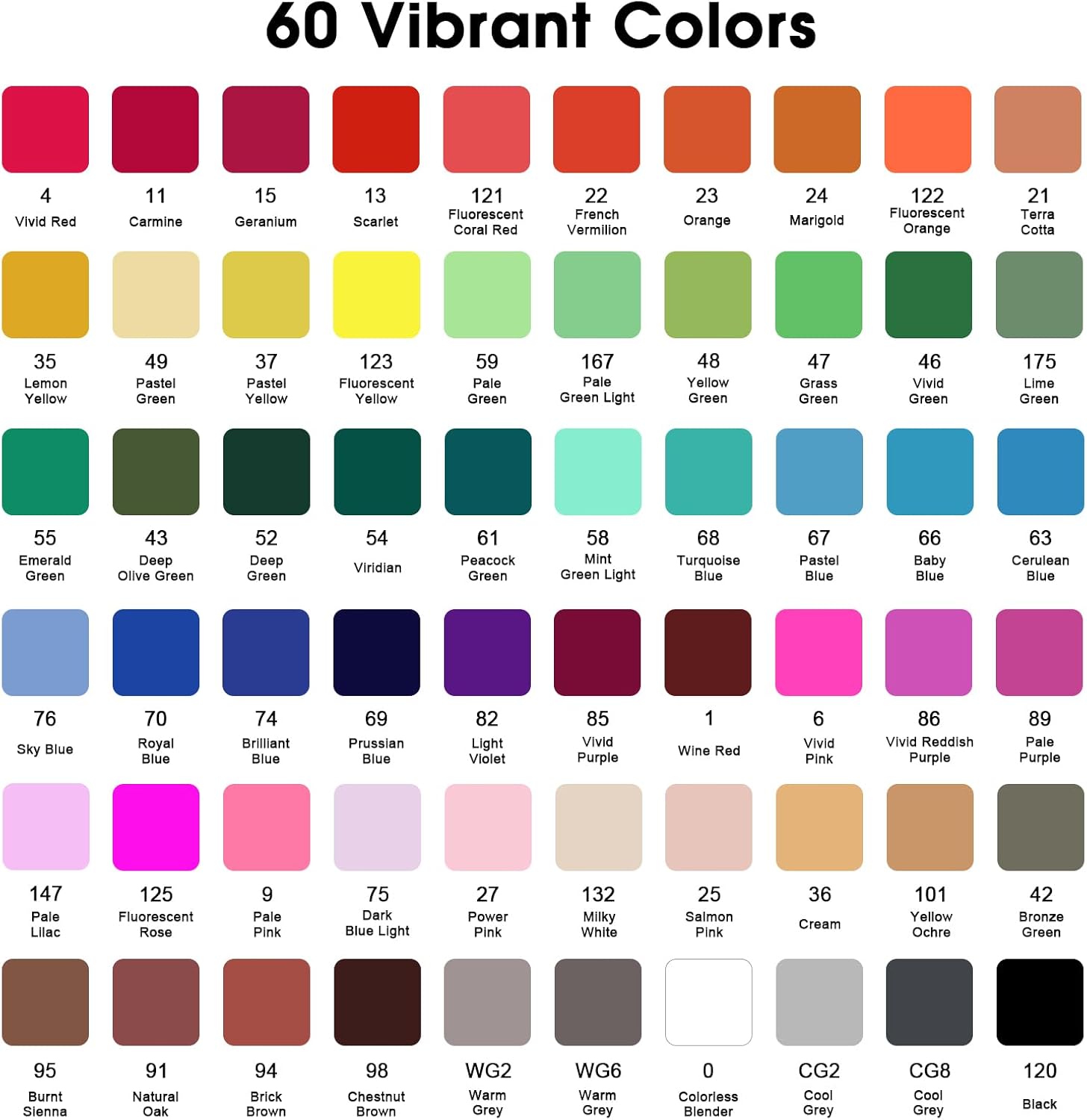 - Vibrant Blendable Colors: Unleash your creativity with 60 colors brush tip alcohol markers featuring ultra-smooth alcohol-based ink that blends seamlessly. Perfect for adult coloring books, these no-bleeding coloring markers deliver rich, fade-resistant hues for professional illustrations, manga art, or casual sketching.