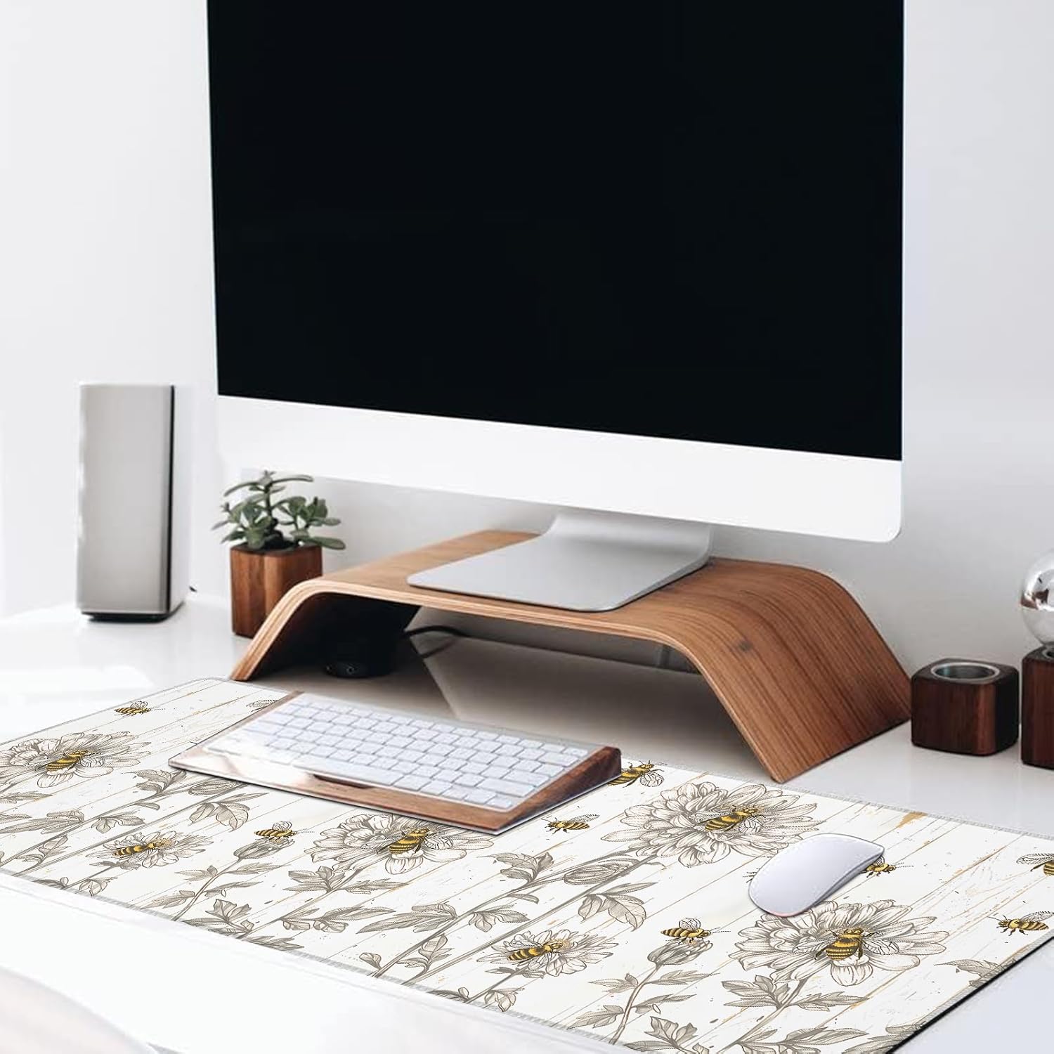 Bee Large Gaming Desk Mat,Rubber Non-Slip Bumble Floral Mouse Pad,31.5x11.8x0.12in Extended Multiple Colors Cute Sketch Bees Mousepad,Game Lover Mice Pads Gifts,Office Home Deskmat Decor