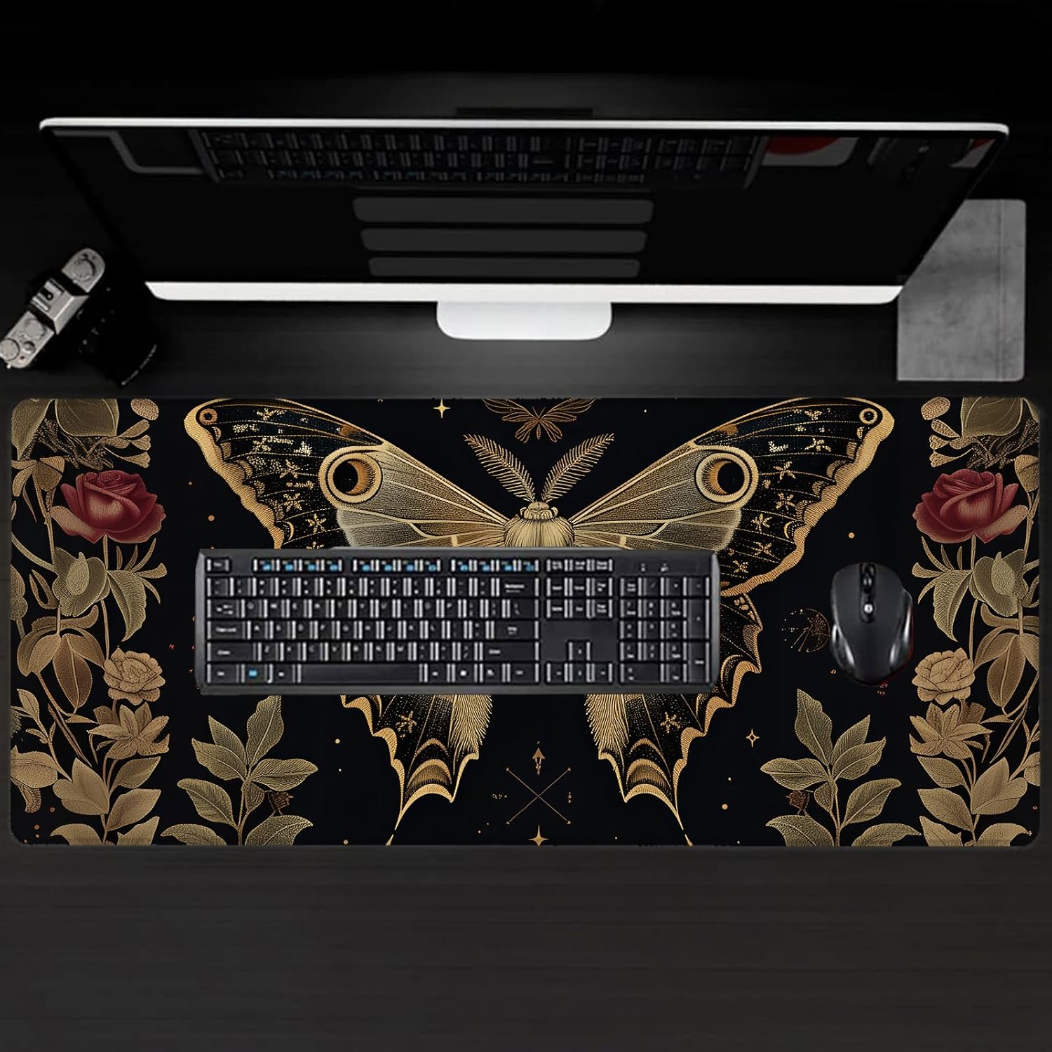 Vintage Moth Rose Large Gaming Desk Mat,Rubber Non-Slip Elegant Nocturnal Mouse Pad,31.5x11.8x0.12in Extended Nature Art Floral Mousepad,Game Lover Mice Pads Gifts,Office Home Deskmat Decor