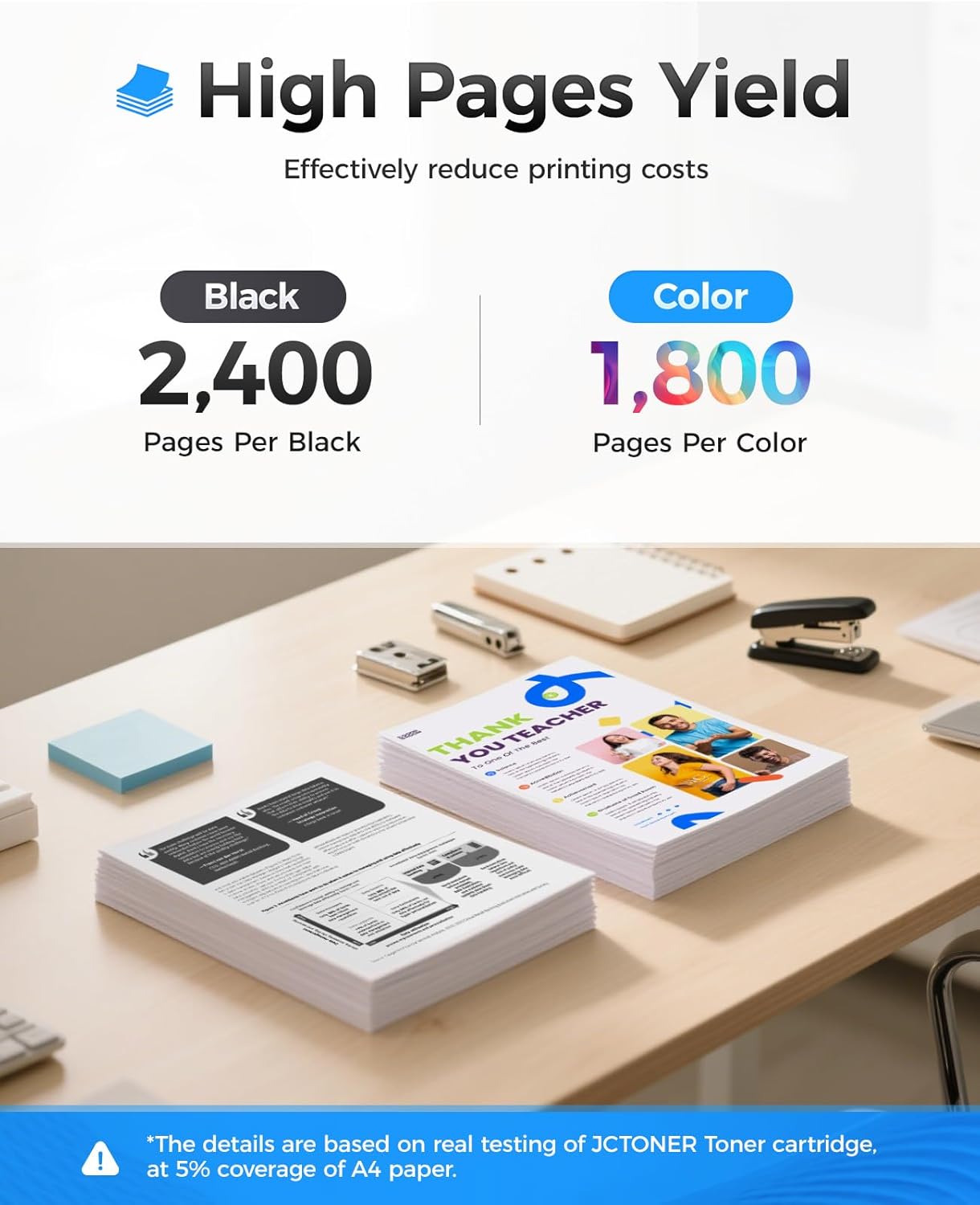 - The latest chip version: The JCTONER toner cartridges are equipped with the latest version of built-in chips, ensuring perfect compatibility between each toner cartridge and the printer. This enables you to print efficiently while maintaining stability and reliability, making installation convenient without the need for manual adjustments. All JCTONER toner cartridges have undergone strict quality testing and have obtained ISO9001 certification. High-quality toner cartridges can meet the demand for high printing volume. The fine toner ensures clear and stain-free printing results and extends the lifespan of the printer. You can purchase with confidence.