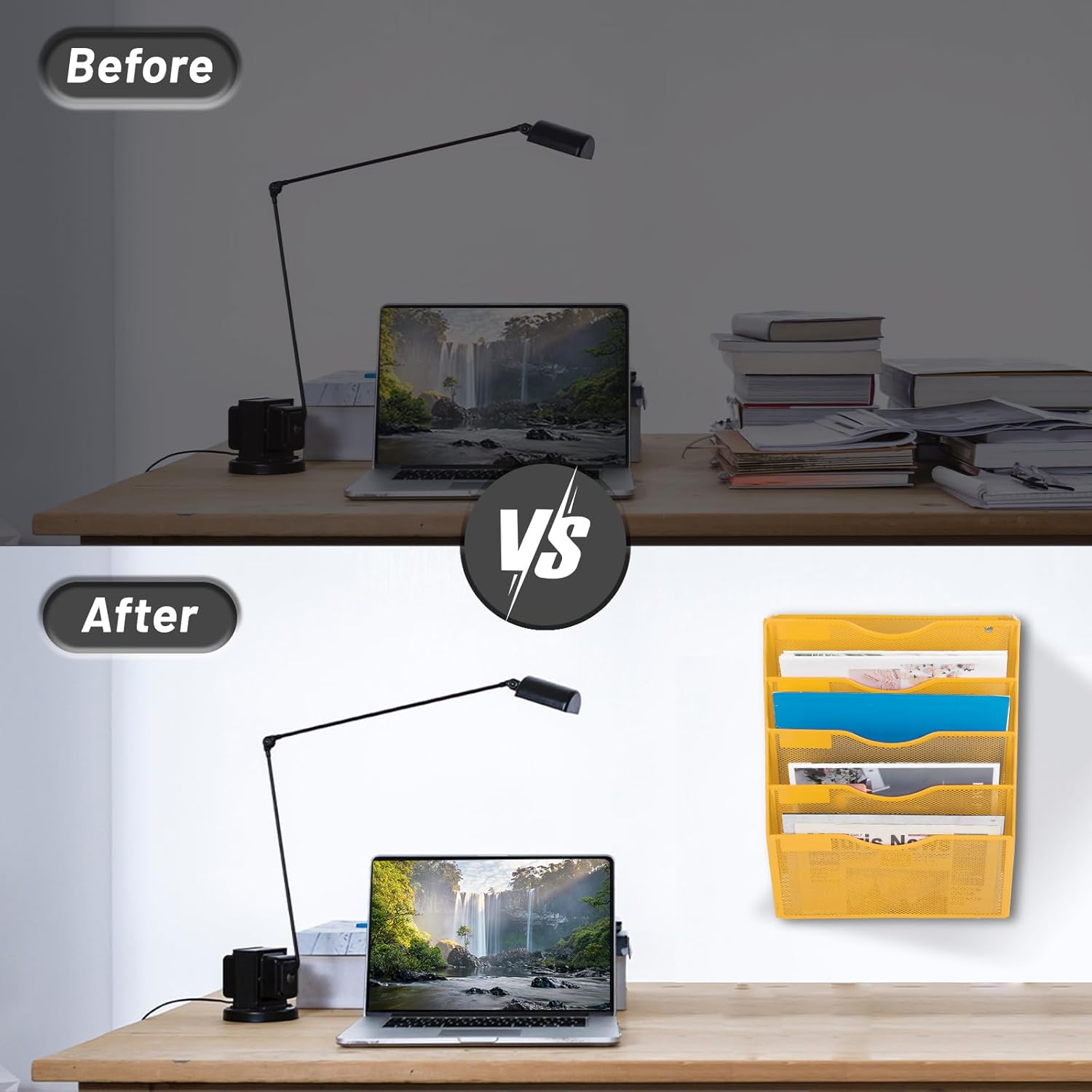 EASEPRES 5 Pocket Mesh Hanging Wall File Organizer, Wall Mounted Mail Paper Document Folder Holder, Clipboard Storage Organization Magazine Rack with Nametag Label for Office Home School, Yellow