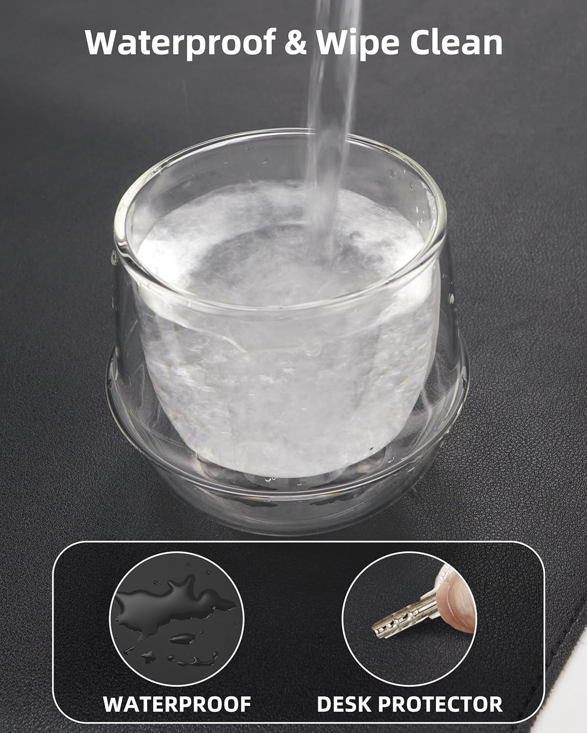- DESK PROTECTOR:Triple-Threat Protection + Workspace:Engineered to shield desktops from scratches, coffee rings (heat-resistant to 212°F), and spills (wipes clean for 24hrs). Reinforced with stealth-matched jet-black stitching that locks in durability. Serves as:Surface can be used as a large mouse pad, comfortable resting surface for your hands while writing, typing, and using the mouse. A must have office or study supplies.