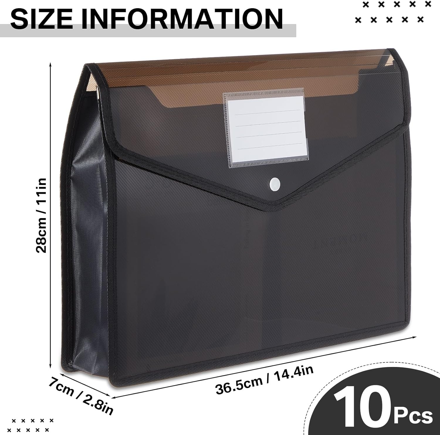 10 Pieces Plastic File Folders Envelope Expanding File Wallet Organizer Documents Folder with Snap Closure and Pocket B4 Waterproof Transparent Pouch for School Office (Black,Horizontal)