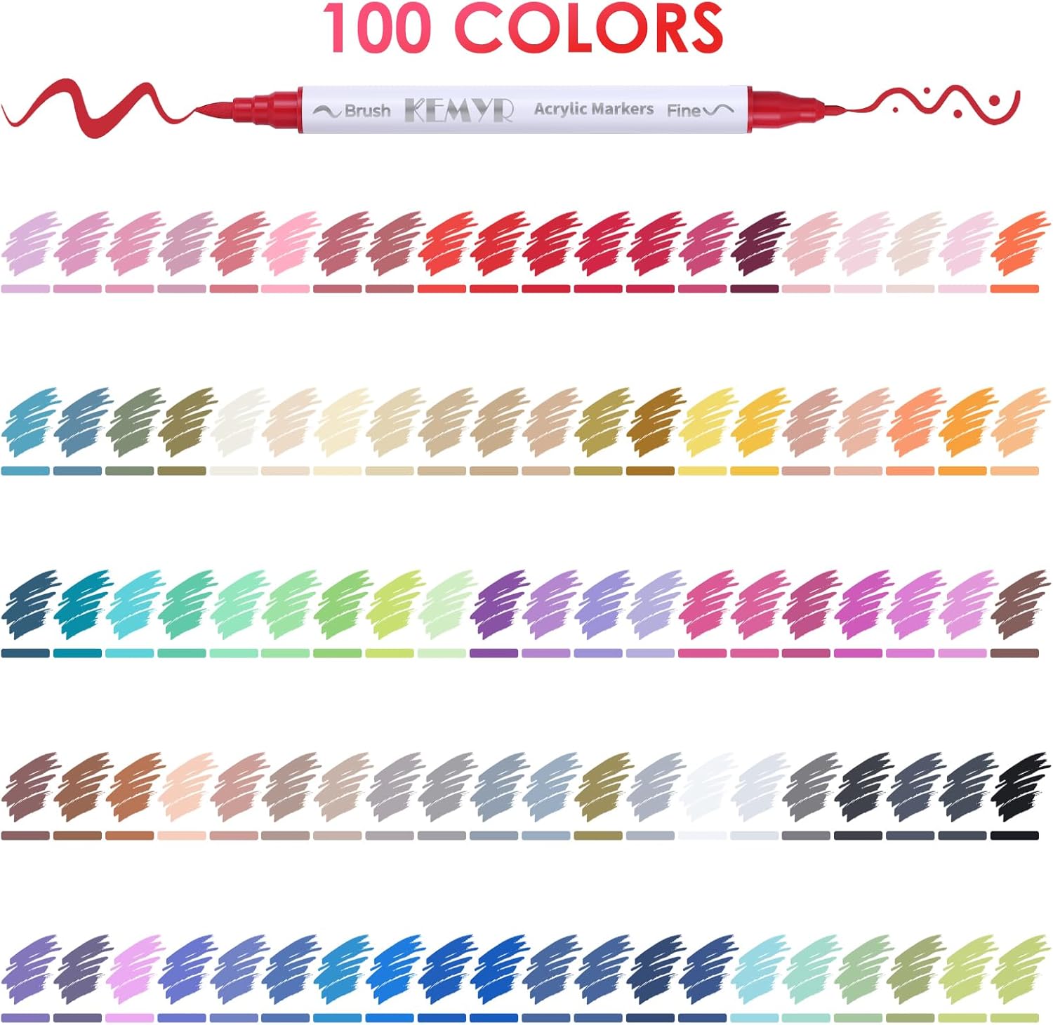 100 Colors Brush & Fine Tip Acrylic Paint Pens, Dual Tip Acrylic Paint Markers for Paper, Wood, Canvas, Stone, Rock, Glass, Fabric, DIY, Ceramic, Art Supplies for Kids and Adults Drawing