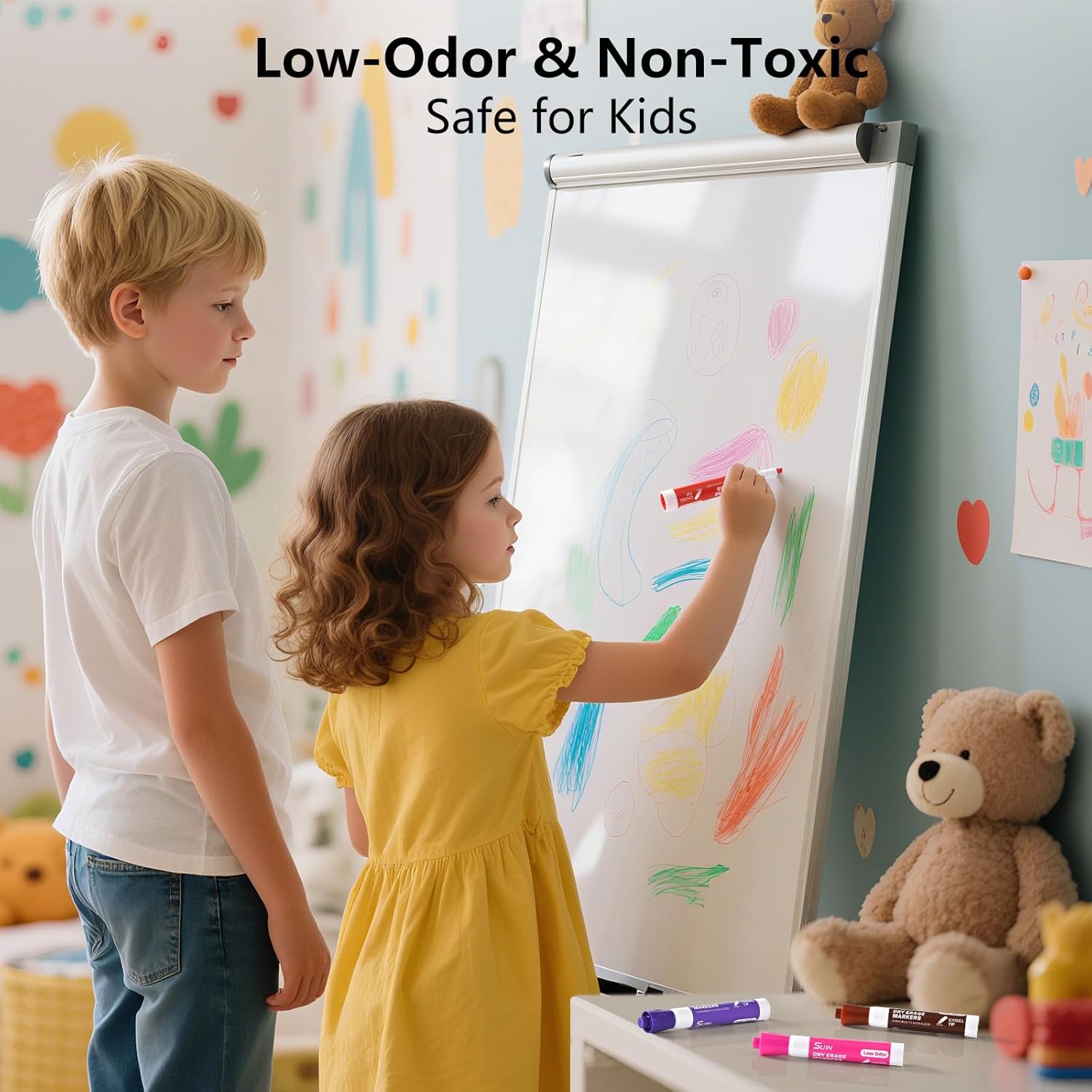 - Pack of 36: Includes 36pcs low dry erase markers with 12 color assorted for vivid and expressive writing and drawing, providing you with more options and long-lasting usage.