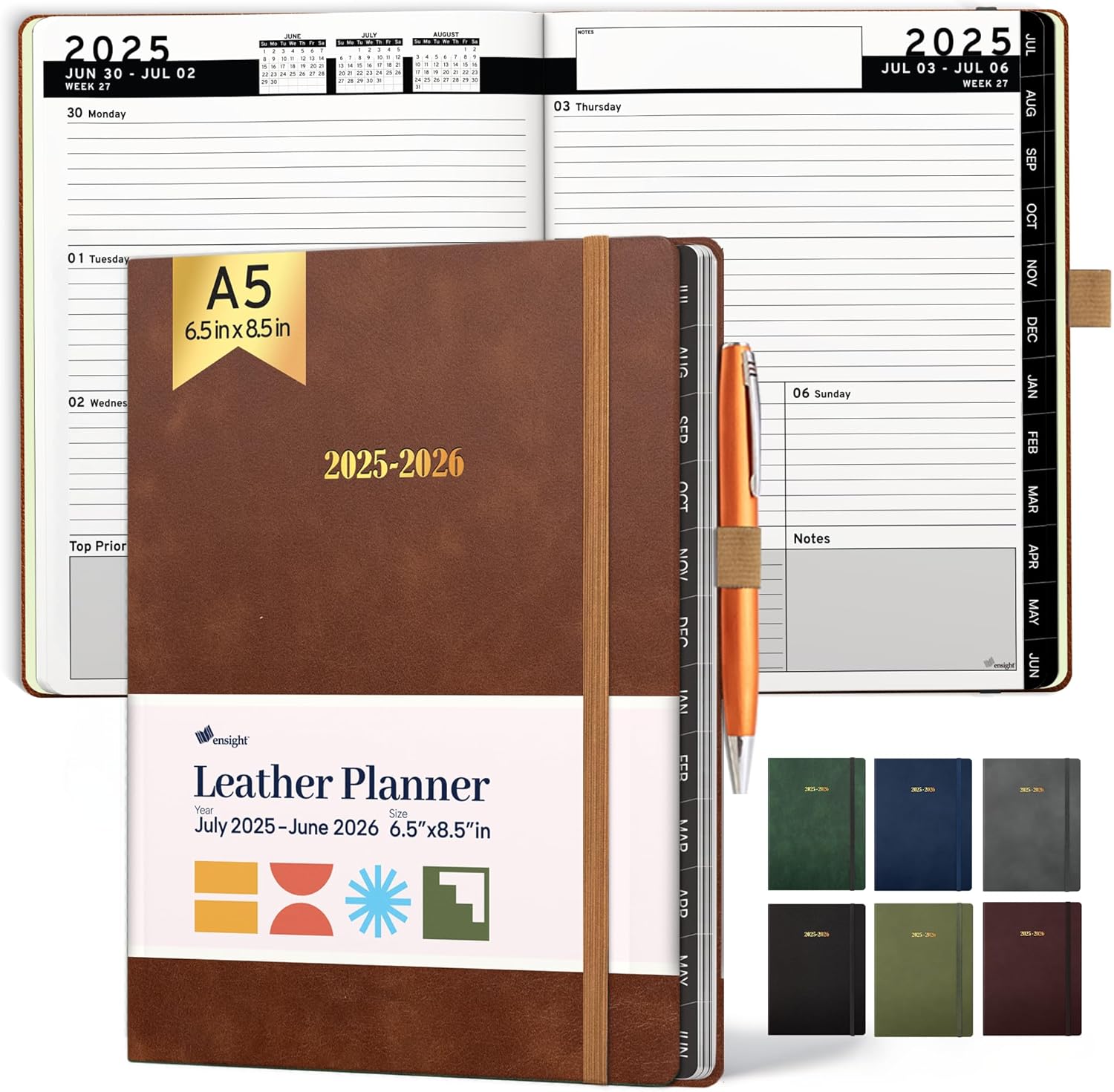 Ensight 2025-2026 HARDCOVER Leather Planner Weekly & Monthly - 6.5x8.5 Inches - Academic Planner Business Personal or Student - Pen Holder, Thick Paper, July 2025 - June 2026 (Brown)