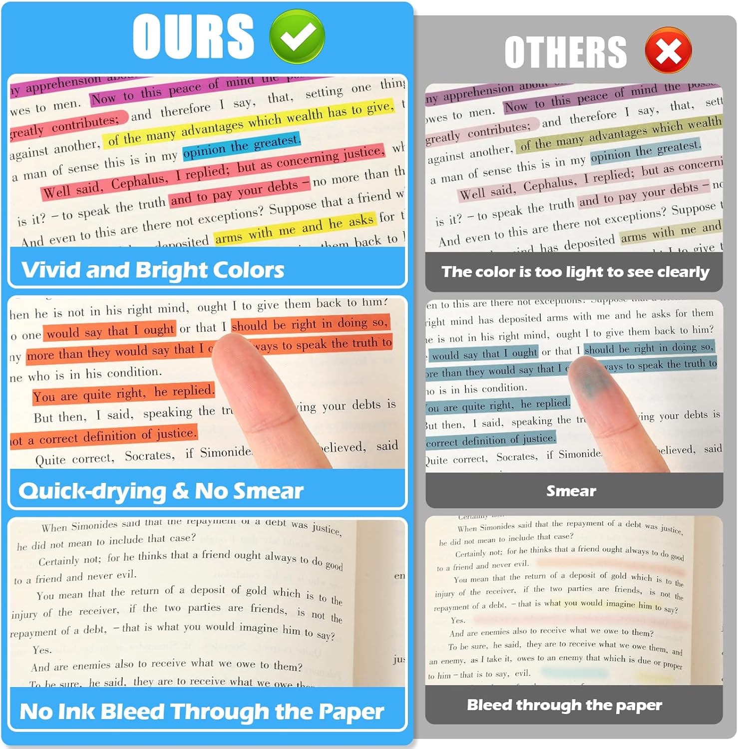 - Non-bleed & Long-Lasting: Features quick-dry ink that makes highlighted marks visible and prevents smudging on hands or pages. Premium refills ensure smooth, vibrant coloring. Our highlighters bulk works on various papers like notes, handouts, sticky notes, planners, and newspapers. Simply replace the cap after use for lasting durability.