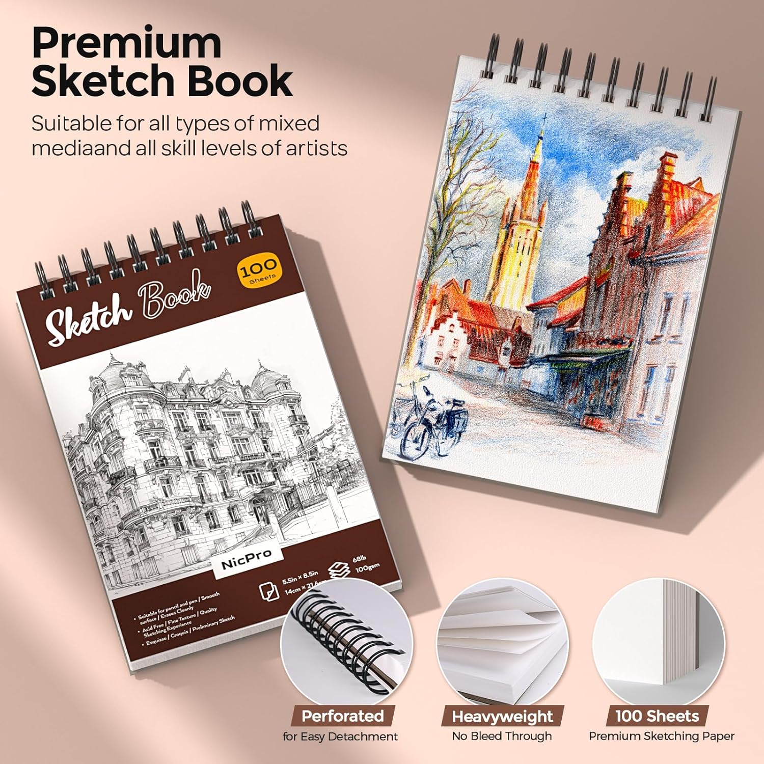 - Included Premium Sketchbook: 5.5 × 8.5 inch, 100 sheets (68lb/100gsm), top spiral-bound for easy flipping. Acid-free and bleed-resistant paper ideal for pencils, pens, and light watercolor. Tear-out pages cleanly without damage—no extra sketch book purchase needed