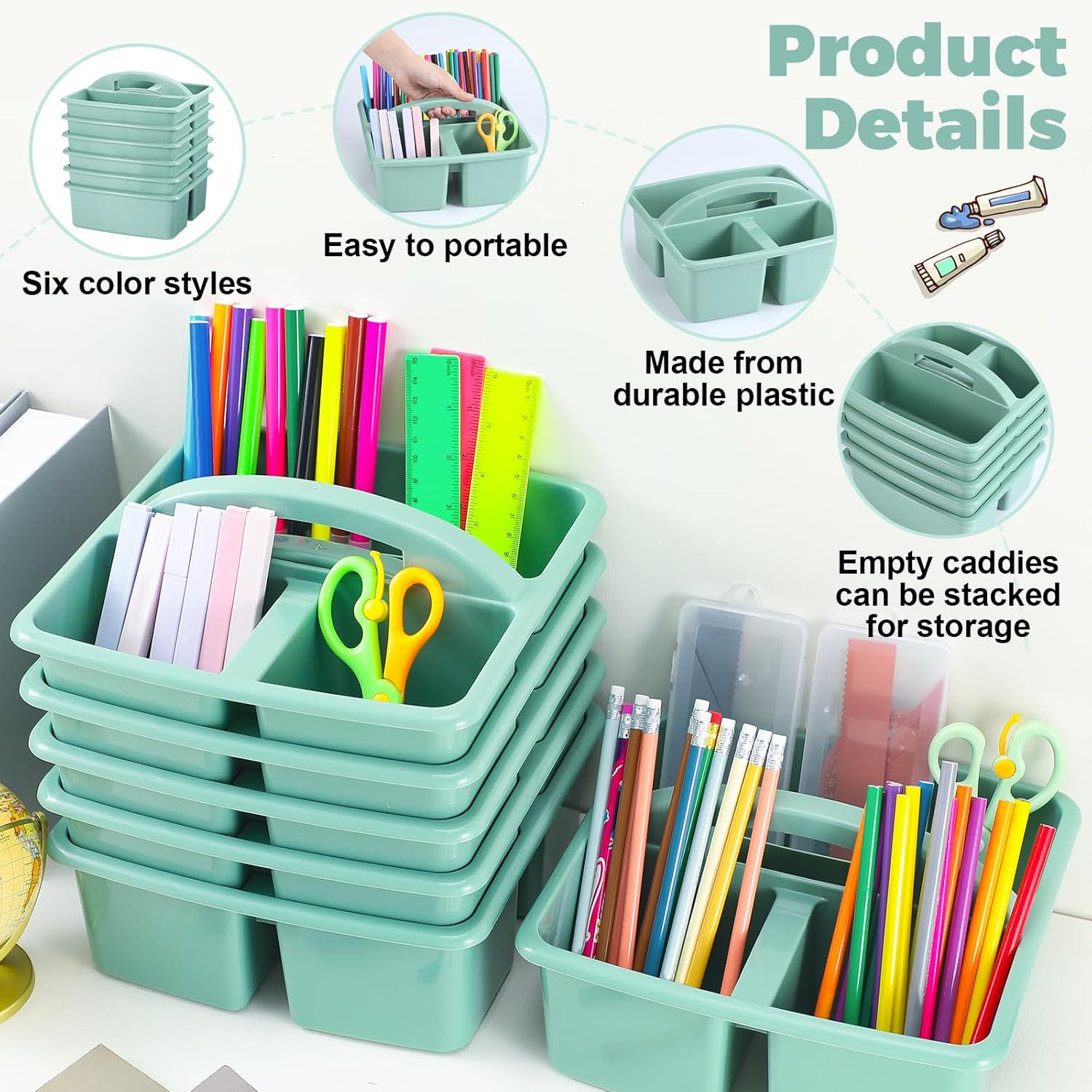 - Versatile Application: These plastic caddies are suitable for a variety of occasions and settings, are essential items for desks, and table groups, and are ideal for pencils, scissors, markers, glue sticks, and other schooling office supplies, helping maintain a neat and orderly space