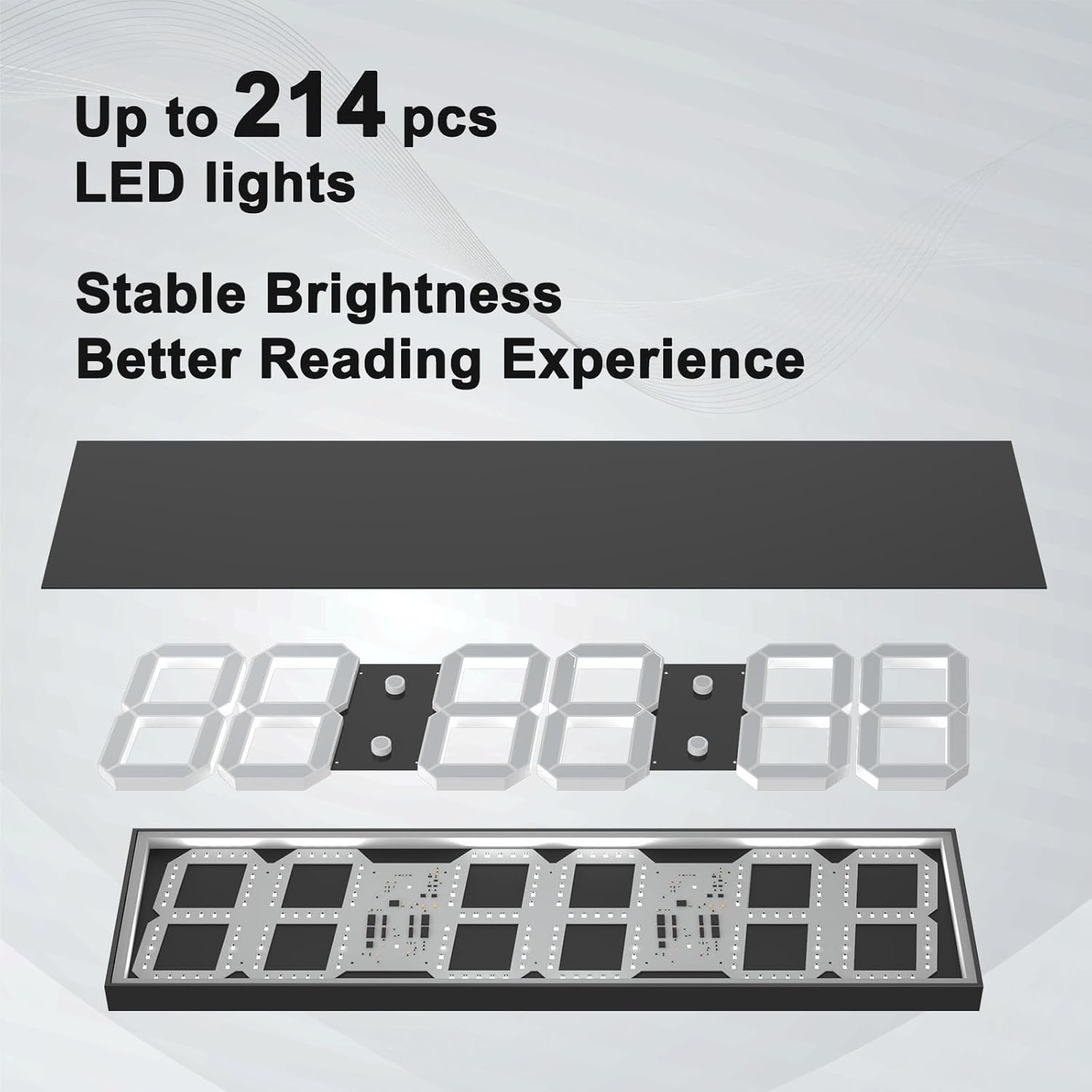 - Better Material for the Large Wall Clock: The digital clock display board cover is made of acrylic, the shell is made of high-strength integration ABS material, ensure the digital clock is light and strong. 214 pcs Led lights of the clock, make sure of your reading experience.The large digital wall clock is powered by a 10-foot power cord for more of your installation needs.