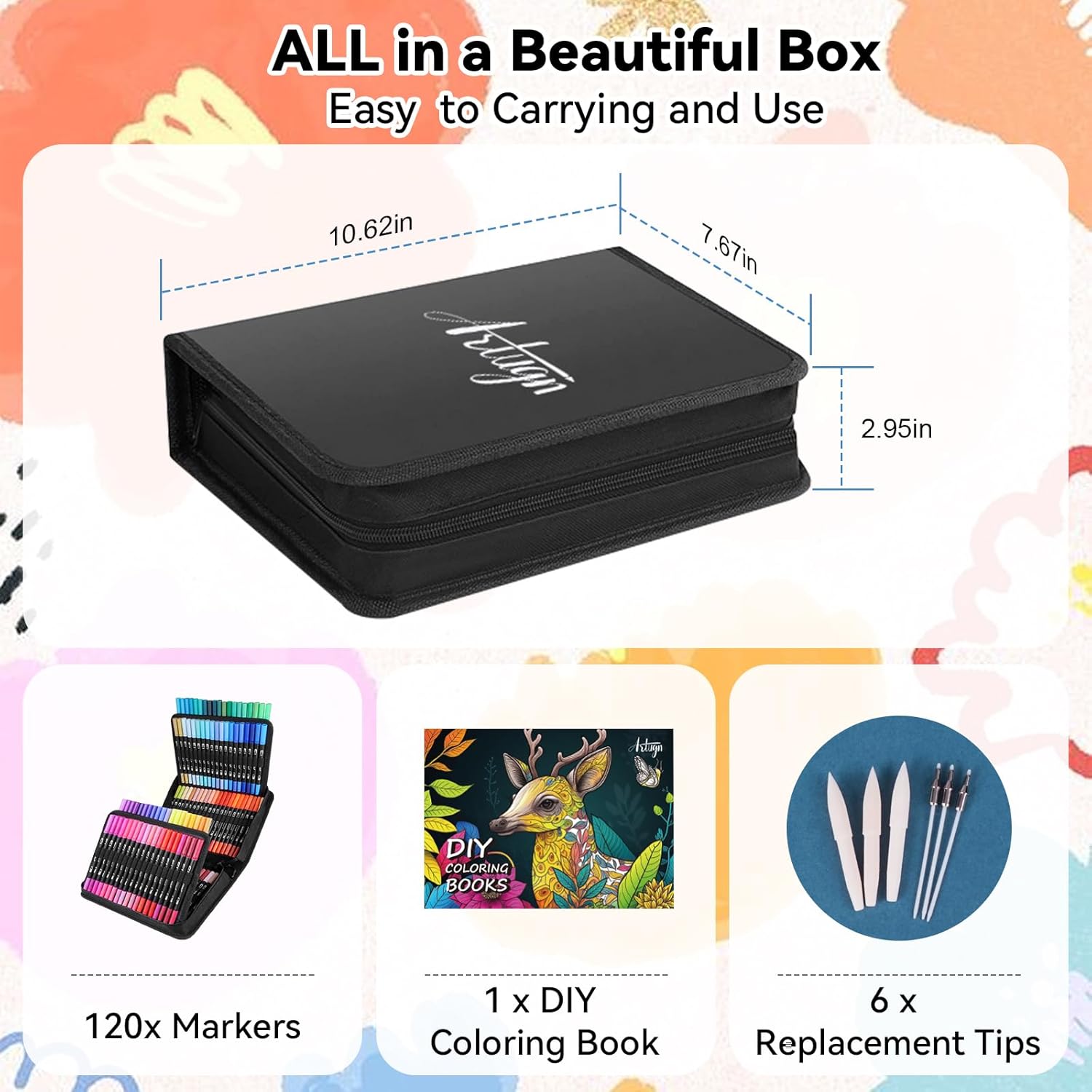 Dual Markers Brush Pens for Adult Kids Coloring Books,120 Colors Art Marker Set with Fine & Brush Tip Pen for Bullet Journaling, Coloring, Drawing, Hand Lettering, Calligraphy, Art Supplies