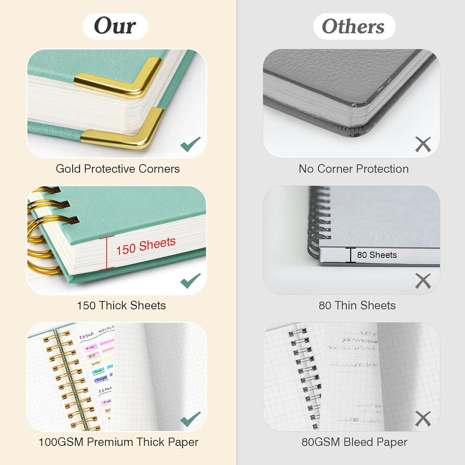 - 【Premium Leather Cover & Strong Binding】Spiral notebook showcases a luxurious leather hard cover, complete with golden corner protectors for extra durability. Its professional design not only looks stylish but is built to last. The strong metal double spiral binding allows for a full 360° lay-flat design, making writing more comfortable and efficient. Whether flipping through or laying the Subject notebook flat, this design guarantees a smooth writing experience.