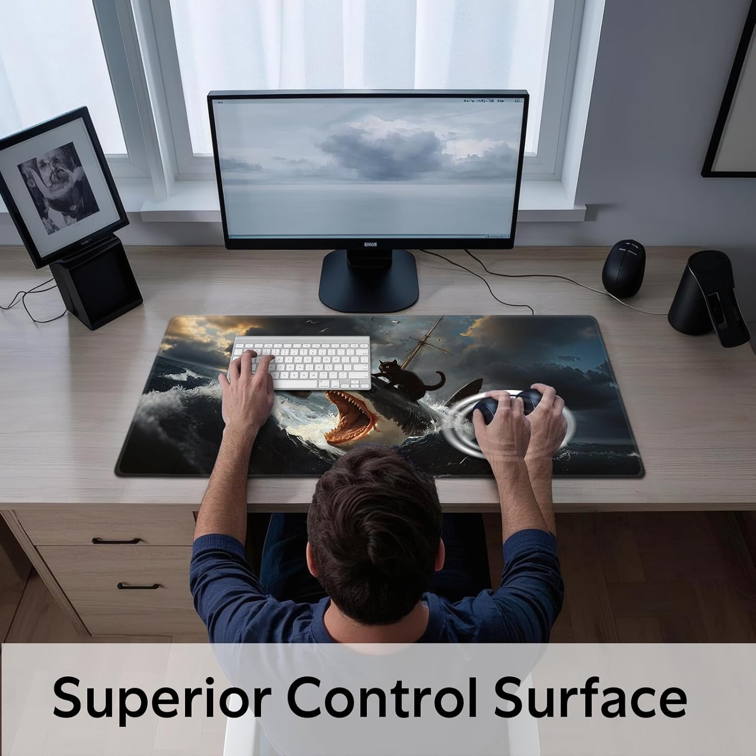 Funny Black Cat Mouse Pad, Abstract Quirky Cat and Shark Mousepad - Large Non-Slip Desk Mat for Office, PC & Laptop - 35.5"x15.7" x 3mm