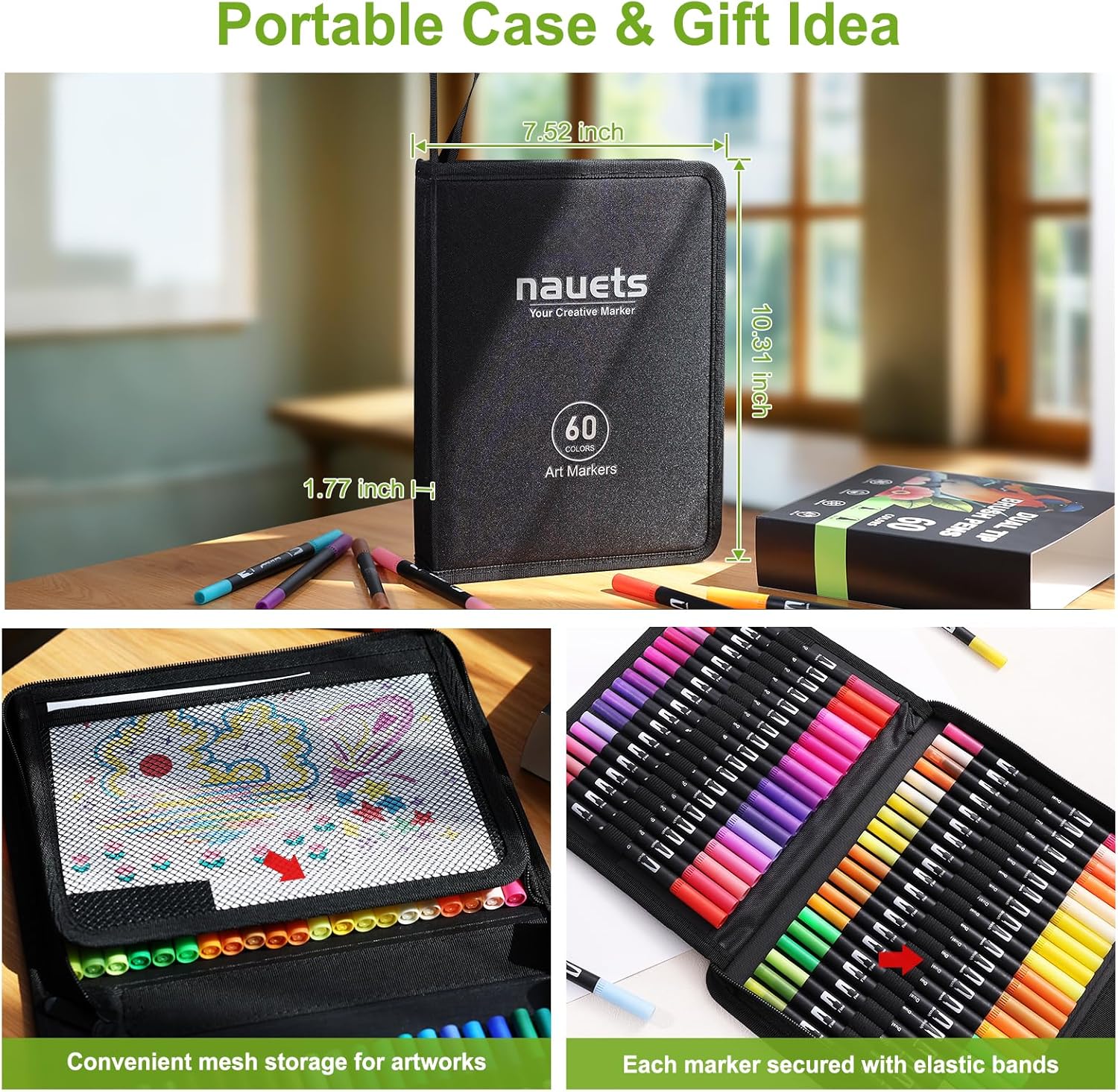 nauets 60 Colors Brush & Fine Dual Tip Watercolor Markers Set for Kids Adults Coloring Books No Bleeding Paint Pens For Drawing Note taking Planner Calligraphy Journaling Card Making Art Supplies