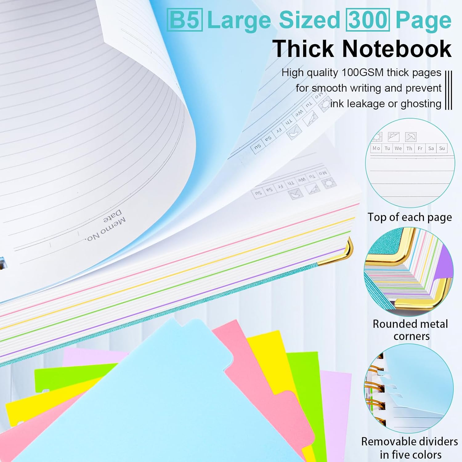 - 300 pages thick notebookļ¼This college ruled spiral notebook features 300 pages of thick paper that resists ink bleed and ghosting. The spacious B5 layout (8"x10") makes it perfect for long-term planning, study notes, and personal journalingāless bulk, more value.