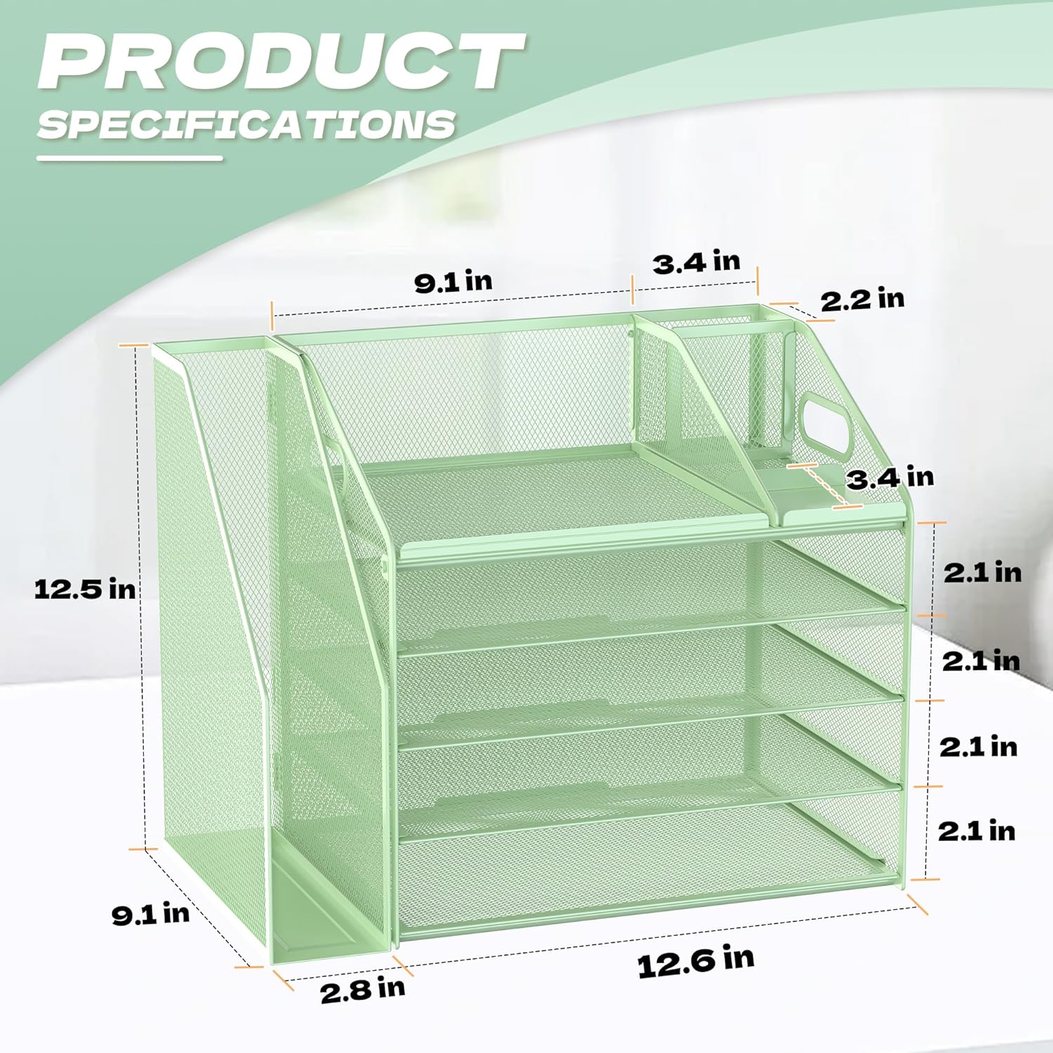 DocNest 5 Tier Paper Letter Tray File Organizer, Mesh Desk File with Handle, Workspace Desk Organizers with Pen Holder, Office Organization Storage Accessories - Green