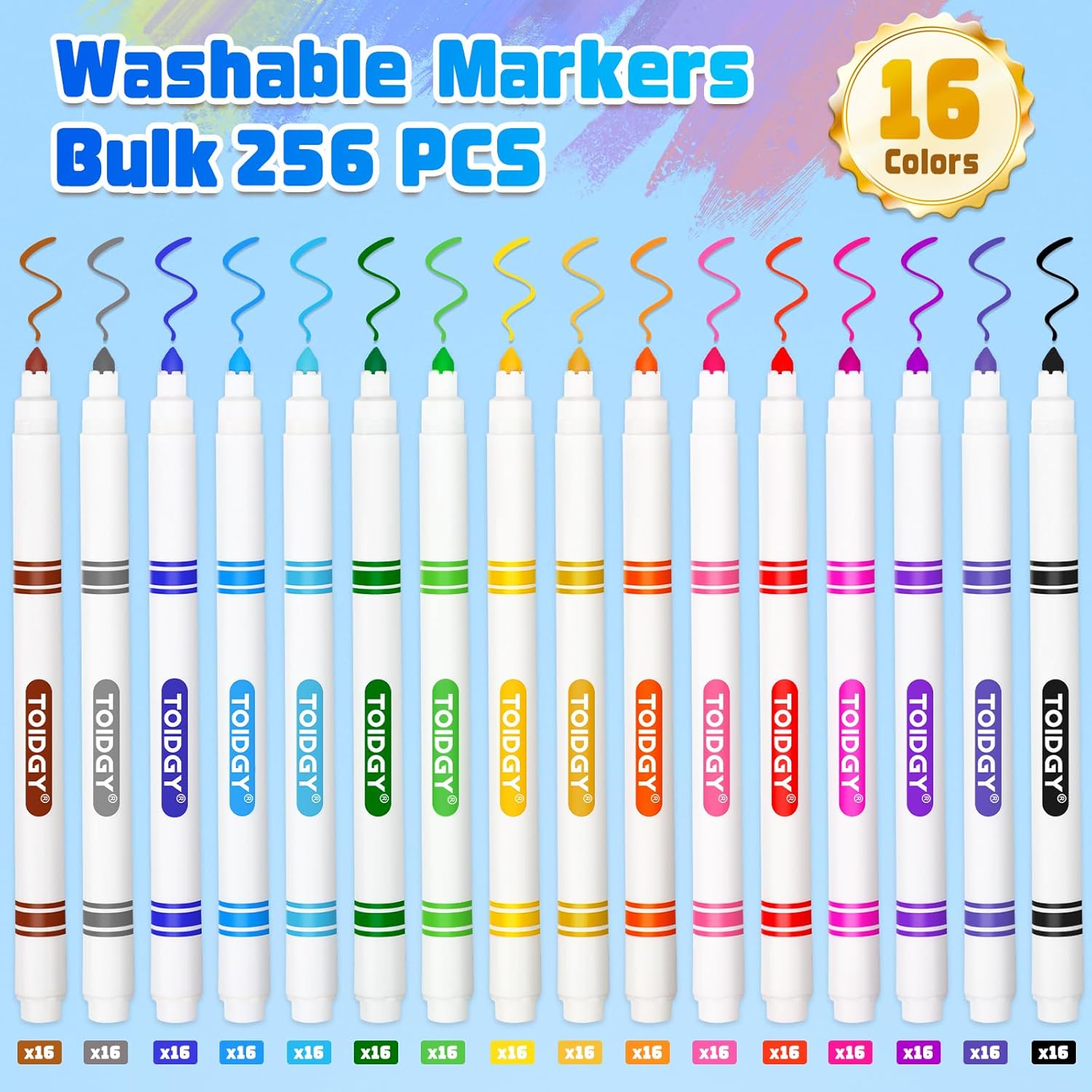 - Ultimate Bulk Washable Markers: Ready to bring a burst of color to your creative adventures? Our 256 PCS markers bulk, available in 16 vibrant colors with 16 counts per shade, is the perfect choice. This colorful bulk sparks imagination and artistic expression, making it an ideal fit for kids school supplies class pack, art classroom must haves, homeschool supplies, and creative studios.