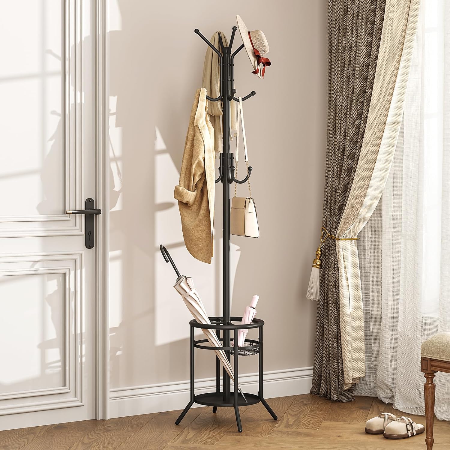 ELYKEN Coat Rack Freestanding, Metal Coat Rack Stand with Umbrella Holder, Modern Coat Tree with 12 Hooks, Floor Standing Corner Hall Tree for Entryway Living Room Bedroom Office, Black