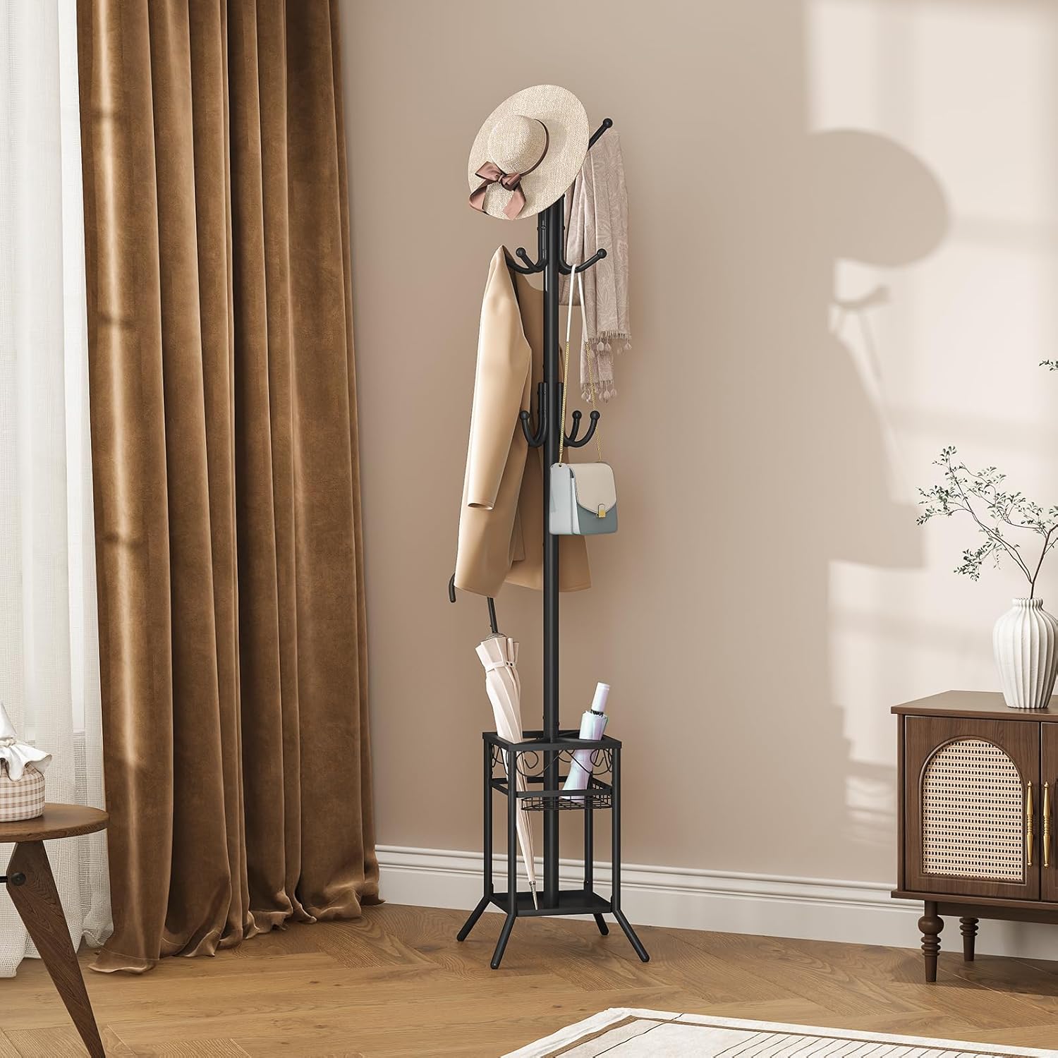 - Stylish & Functional: This coat rack with umbrella holder not only serves as a chic coat hanger stand but also enhances any space. Available in three elegant colors, it seamlessly fits into your hallway, foyer, closet, bedroom, office, or any corner needing an organizational touch