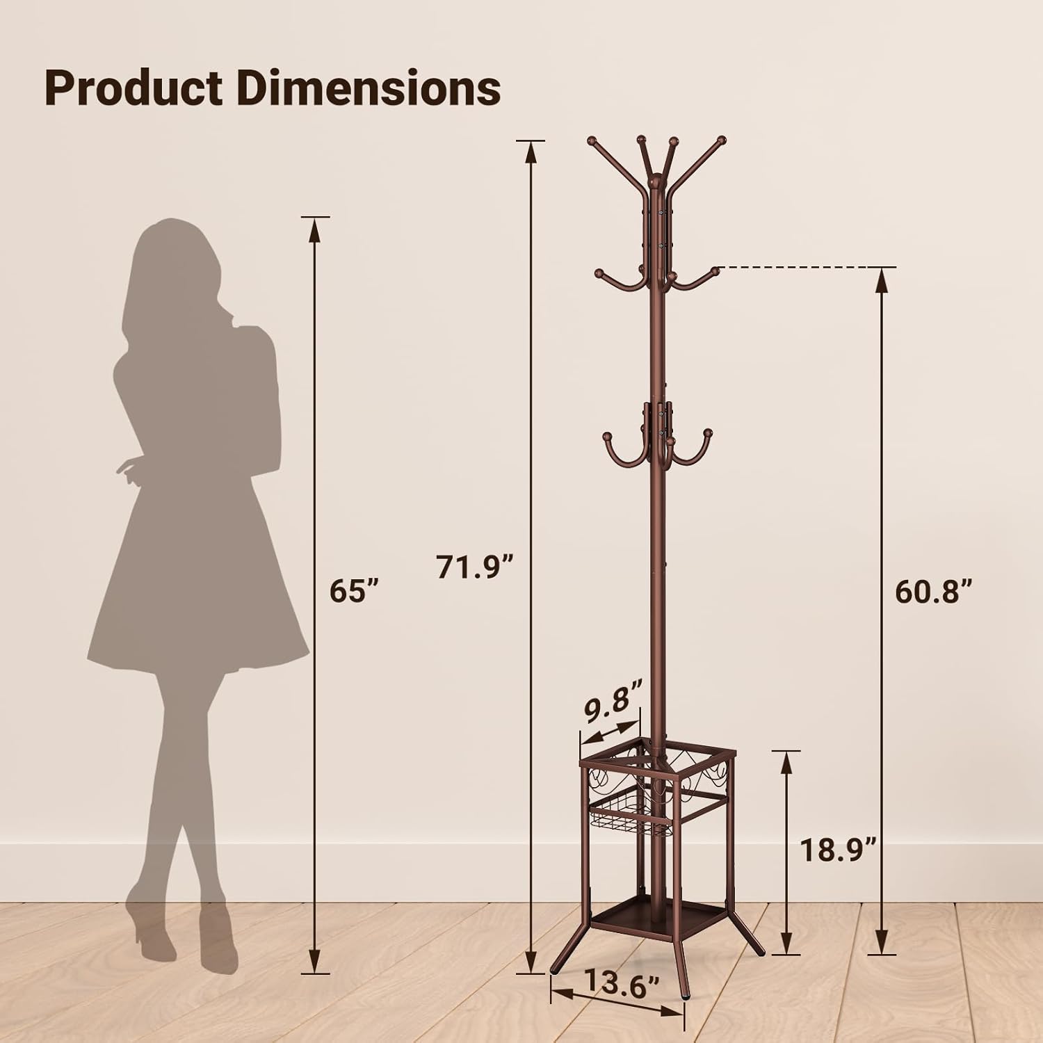 ELYKEN Coat Rack Freestanding, Metal Coat Rack Stand with Umbrella Holder, Modern Coat Tree with 12 Hooks, Floor Standing Corner Hall Tree for Entryway Living Room Bedroom Office, Brown