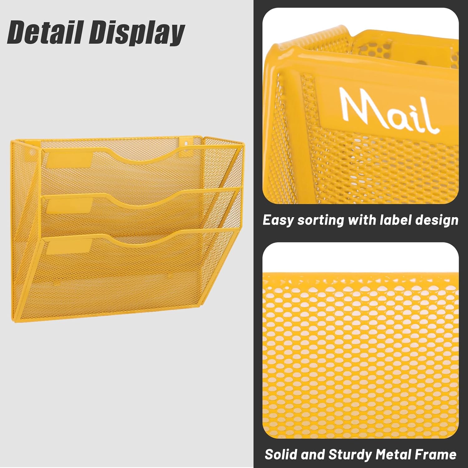 EASEPRES 3 Pocket Mesh Hanging Wall File Organizer, Wall Mounted Mail Paper Document Folder Holder, Clipboard Storage Organization Magazine Rack with Nametag Label for Office Home School, Yellow