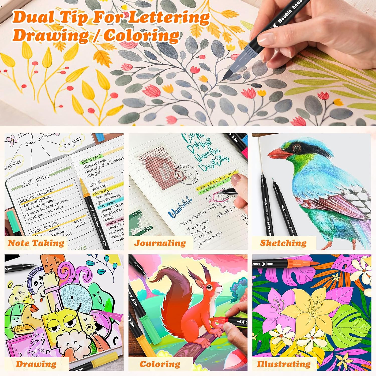 - Creative Dual-Tip Design - This premium art marker set features a revolutionary dual-tip design— as the fine tip markers, 0.5mm fine point for crisp outlines, detailed sketching, and elegant calligraphy. As a brush tip markers, flexible 1-2mm brush tip help smooth shading, blending, and bold coloring. Tilt the brush to effortlessly switch between fine lines and expressive strokes, making it perfect for adult coloring books, bullet journaling, kids’ art projects, and professional illustrations.