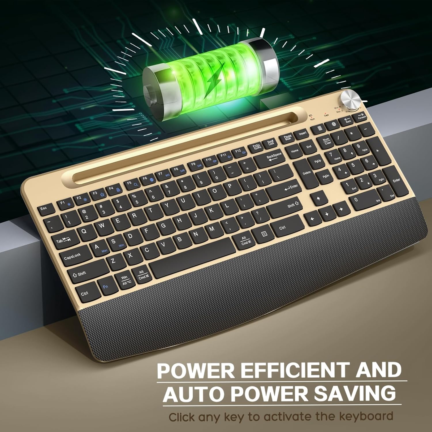 Ergonomic Wireless Keyboard with Wrist Rest-Low-Profile,Phone/Tablet Holder,Quiet Design,Windows & Mac OS,Full Size Cordless USB Computer Keyboard for Desktop,Laptop, PC, Mac, Windows-Gold