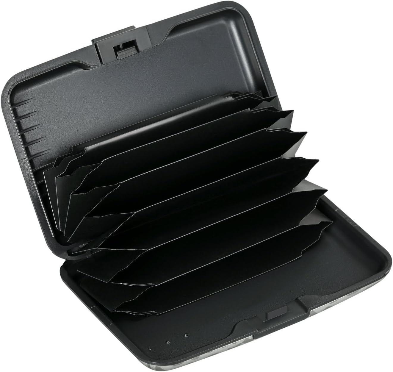 - Latches safely and securely when not in use. Rounded corner wouldn't damage on your clothes. With 7 accordion Slots, Capacity for up to more than 9 credit cards or more than 21 business cards.