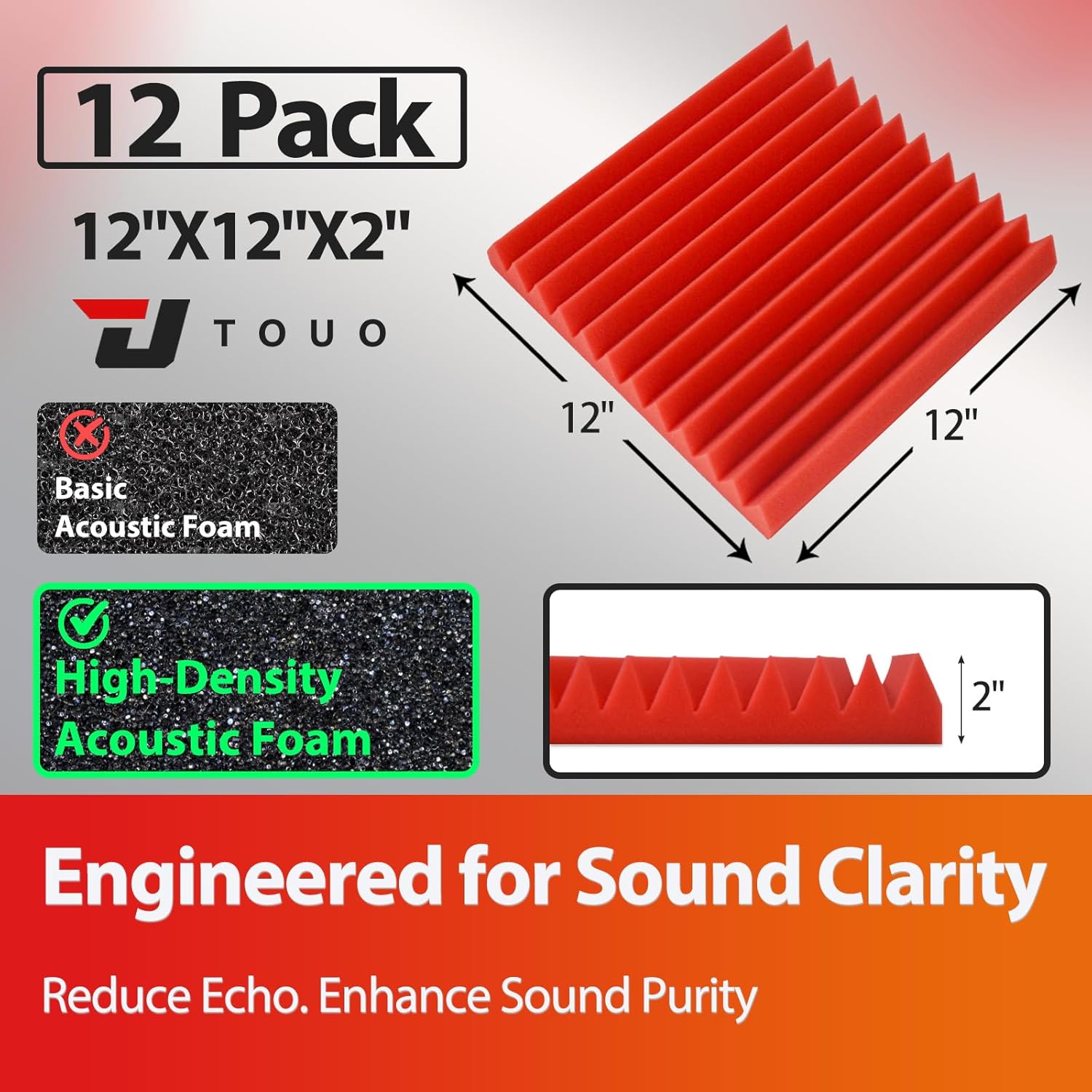 12 Pack Acoustic Panels – Sound Proof Foam Panels for Wall 12"x12"x2", Flame Retardant Wedge Acoustic Foam, High-Density Sound Absorbing Panels for Home Studio(Red, 2" Thick 12 Pack)