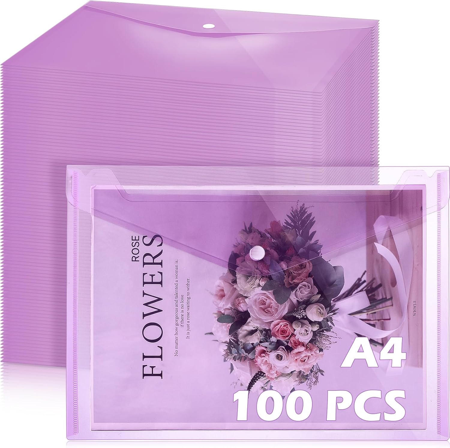 100 Pcs Clear Envelopes with Snap Button Closure Bulk A4 Letter Size Clear Plastic Envelope Folder Document Organizer File Folders for Office Home (Purple)