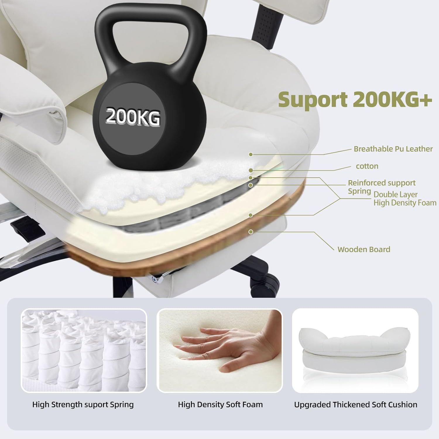 - Cushion-Like Feel in a White Office Chair with Footrest Enjoy all-day softness with the spring-based, memory foam seat in this white chair. The thick cushion feels like a sofa, while the reclining backrest and hidden retractable footrest offer true relaxation. Whether you’re working or resting, this white office chair with footrest helps keep you refreshed and supported.
