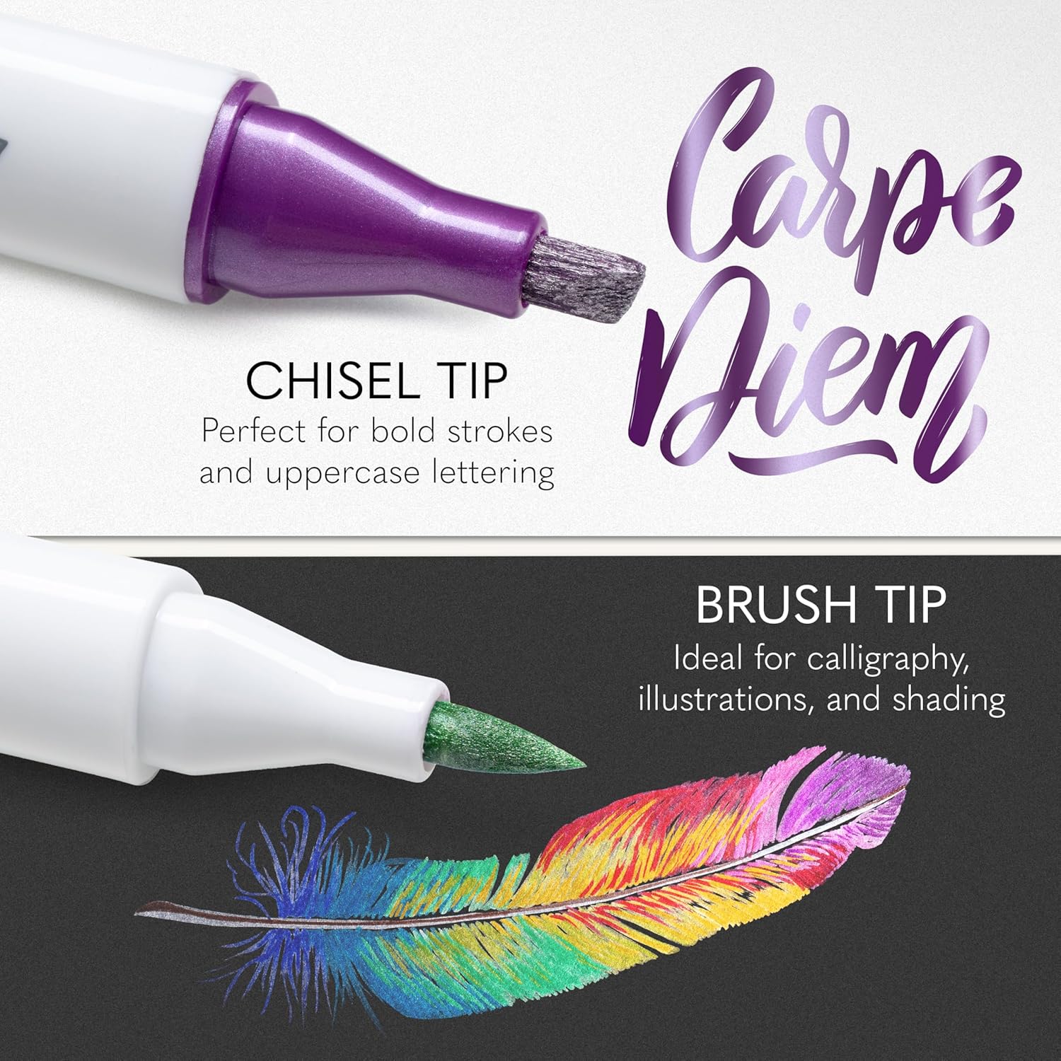 - Dual Tip Versatility: Unlock artistic flexibility with two precision tips. Use the brush tip for flowing lines, shading, and expressive calligraphy. Flip to the chisel tip for crisp lettering, bold strokes, and clean outlines. These dual-function markers adapt to every technique and surface, giving you complete control and comfort while creating professional-looking results from scrapbooks to signage. Perfect for crafts, journaling, DIY decor, and personalized projects.