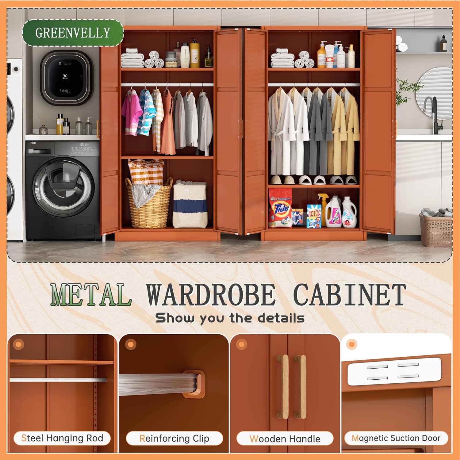 - Safe & Stable Wardrobe: Greenvelly Metal Armoire Cabinet Doors are equipped with 2 powerful magnetic closures to ensure that the doors close tightly and keep your belongings safe from dust. In addition, its well-designed anti-tipping system enables the steel wardrobe to be securely fixed to the wall, effectively preventing the possibility of accidental tipping.Metal storage cabinet can be used with confidence, especially for families with children.