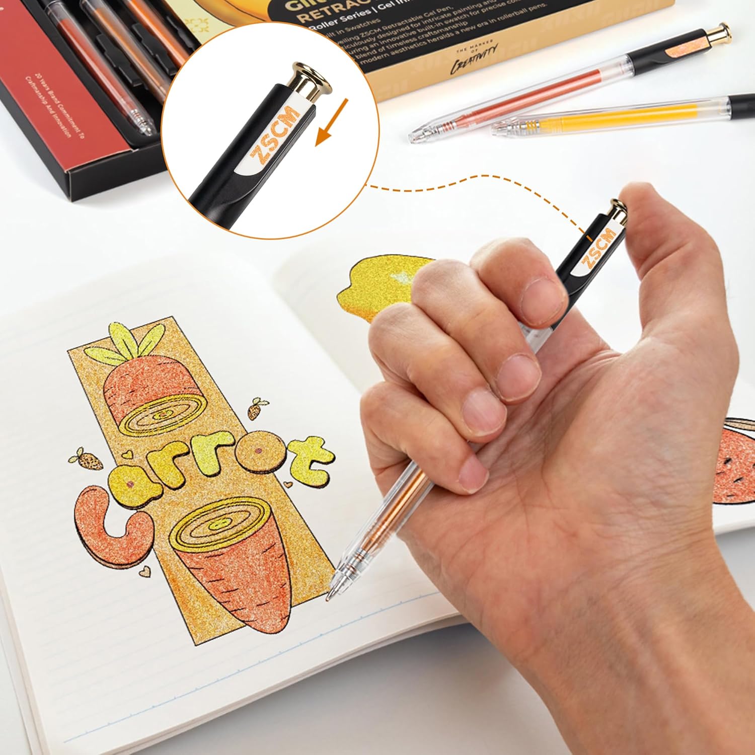 - Perfect Gift & Portable Storage:This 12-piece retractable glitter gel pen set comes in a deluxe drawer-style box with molded tray to securely hold each glitter pen. Perfectly packaged for gifting to artists, crafters, and stationery enthusiasts. The anti-slip tray keeps pens organized whether at home, office, or on-the-go - ready to spark creativity anytime!
