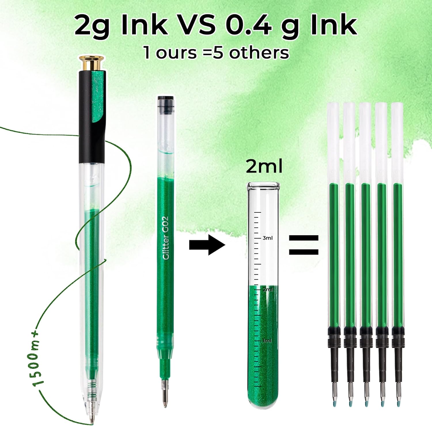 - 12 Lush Green Glitter Shades:Reconnect with nature with ZSCM 12-color Green Glitter Gel Pens, from mint to emerald. With smooth retractable mechanism and 1.0mm precision tip, the glitter ink formula creates vibrant botanical effects for herbarium journals, tropical leaf drawings, and landscape sketching. Unique lightfast technology ensures your green artworks won't fade over time, while the flexible tip handles both details and shading. Bring greenery to life with dazzling sparkle!
