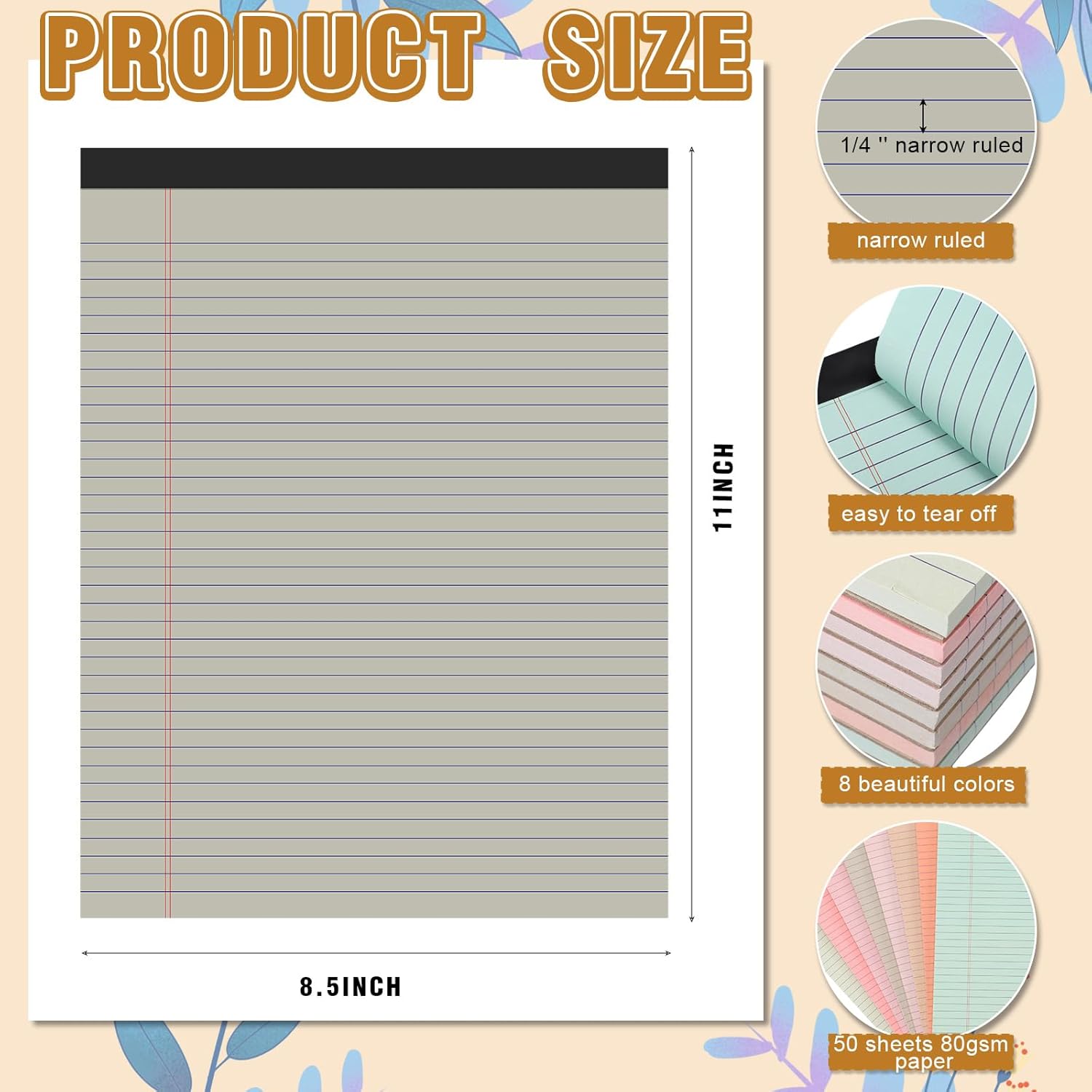 Fuutreo 8 Pcs 8.5'' x 11'' Colored Legal Pad Writing Pads Narrow Ruled 50 Sheets Per Notepad Perforated Writing Notepad Office Supplies for College Office Business (Bohemian Color)