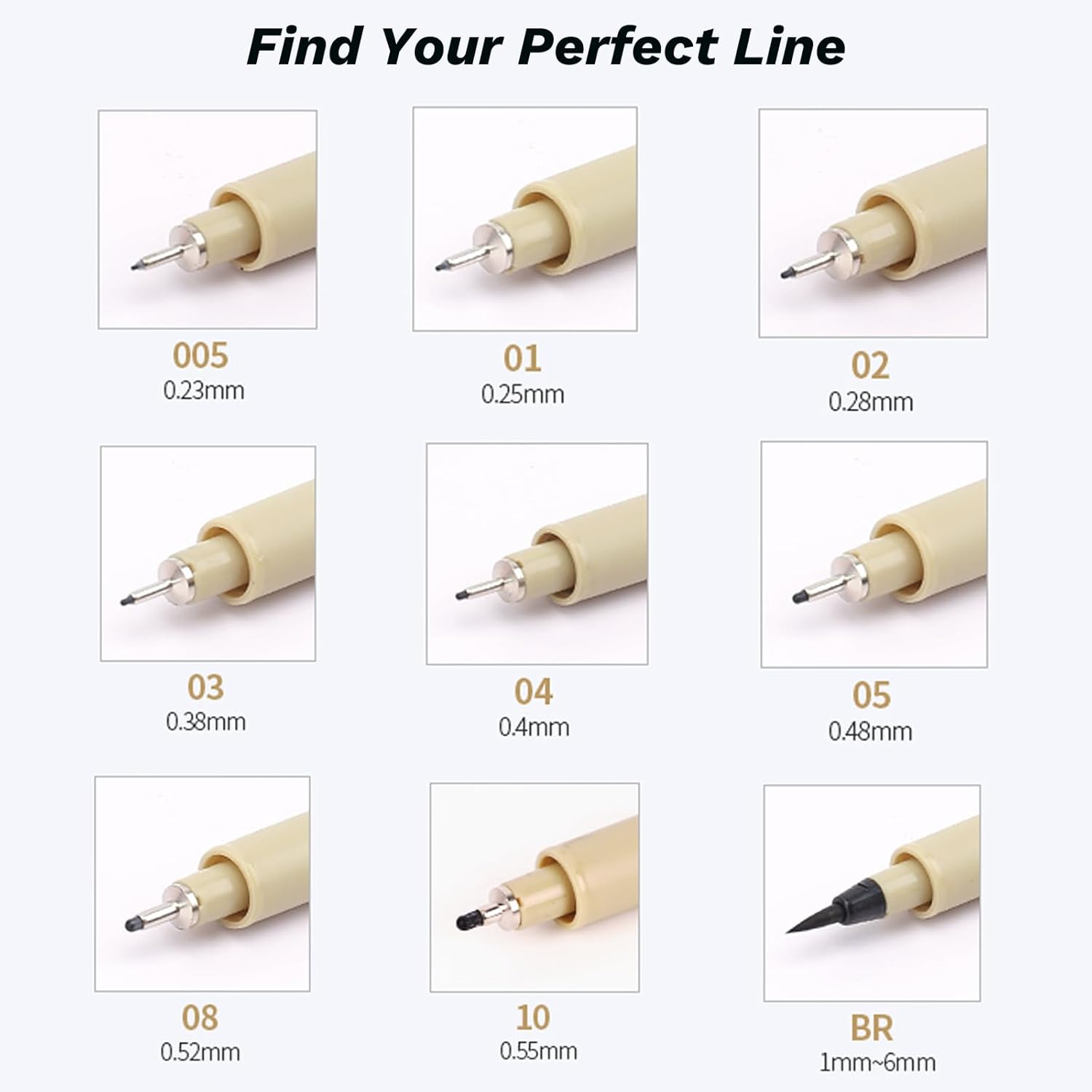 - Complete 12-Pen Set: Available in 9 or 12 pen sets, this multisize fineliner pen set for artists ranges from ultra-fine 005 to brush tip (BR), a complete fineliner pen set perfect for manga artists, illustrators, and journalers