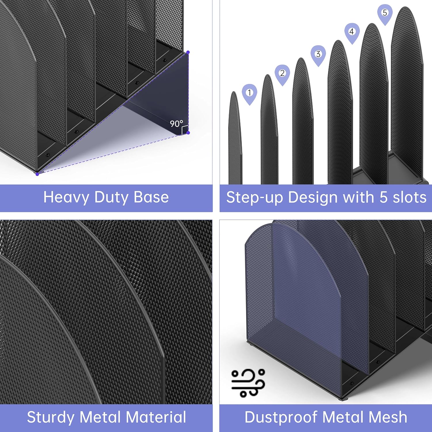 Desk File Organizer, Vertical File Folder Organizer with 5-Section, Document & Record Holder and Storage for Home Office School, Black