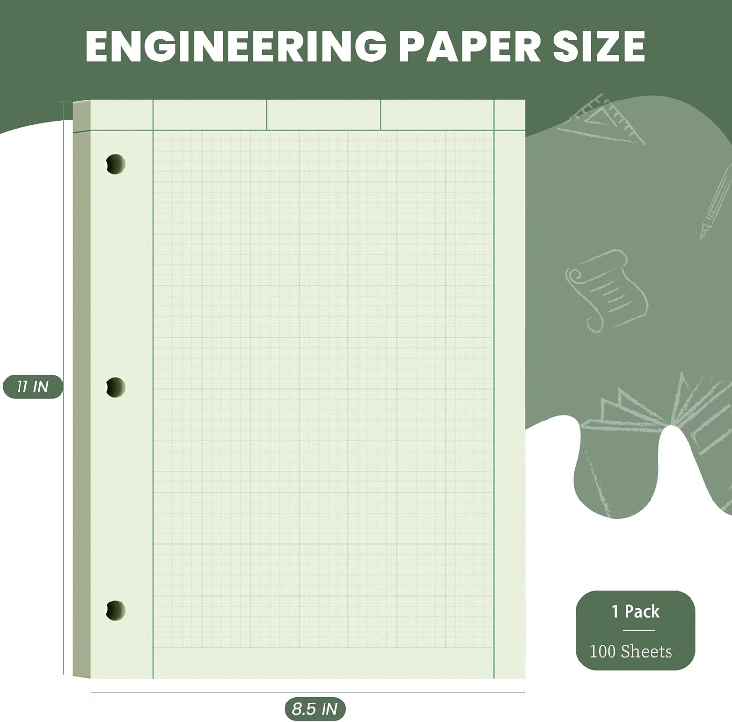 - [Glue-Top Binding with 3-Hole Punching]: The Engineering paper notepad 8.5 x 11 adopts a convenient top-glue binding that allows for easy tear-off without damaging the sheet. Engineering paper loose leaf 3-hole punched design fits most standard binders, making organization simple. A rigid chipboard backing provides added support for writing on the go or without a desk
