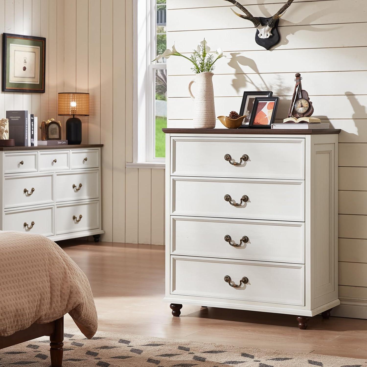 Farmhouse 4 Drawer Dresser for Bedroom, 37" Tall Rustic Chests of Drawers w/ 4 Solid Wood Feet, Mid Century Modern Wooden Closet Storage Dressers Organizer for Living Room, Hallway, White