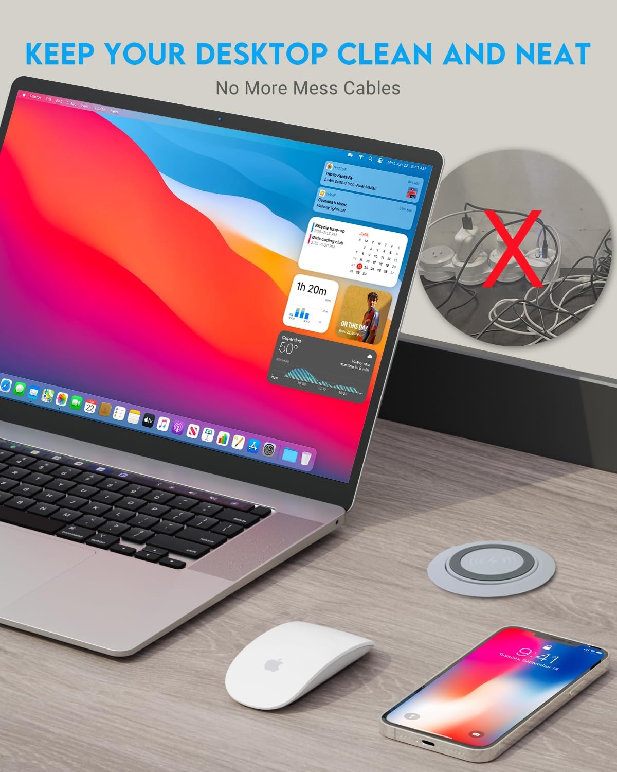 - Phone Charger with Hidden Design: The recessed desk charger is a round invisible mounted charger that saves space. When not in use, it can be perfectly integrated into the environment, keeping the space clean and beautiful