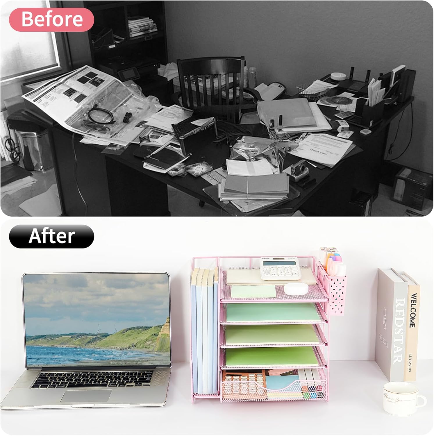 - 【Versatile Storage】This desktop organizer features 5 cardboard trays and a vertical file holder for sorting documents and notes. The included pen cup and drawer provide dedicated storage for all your office accessories.