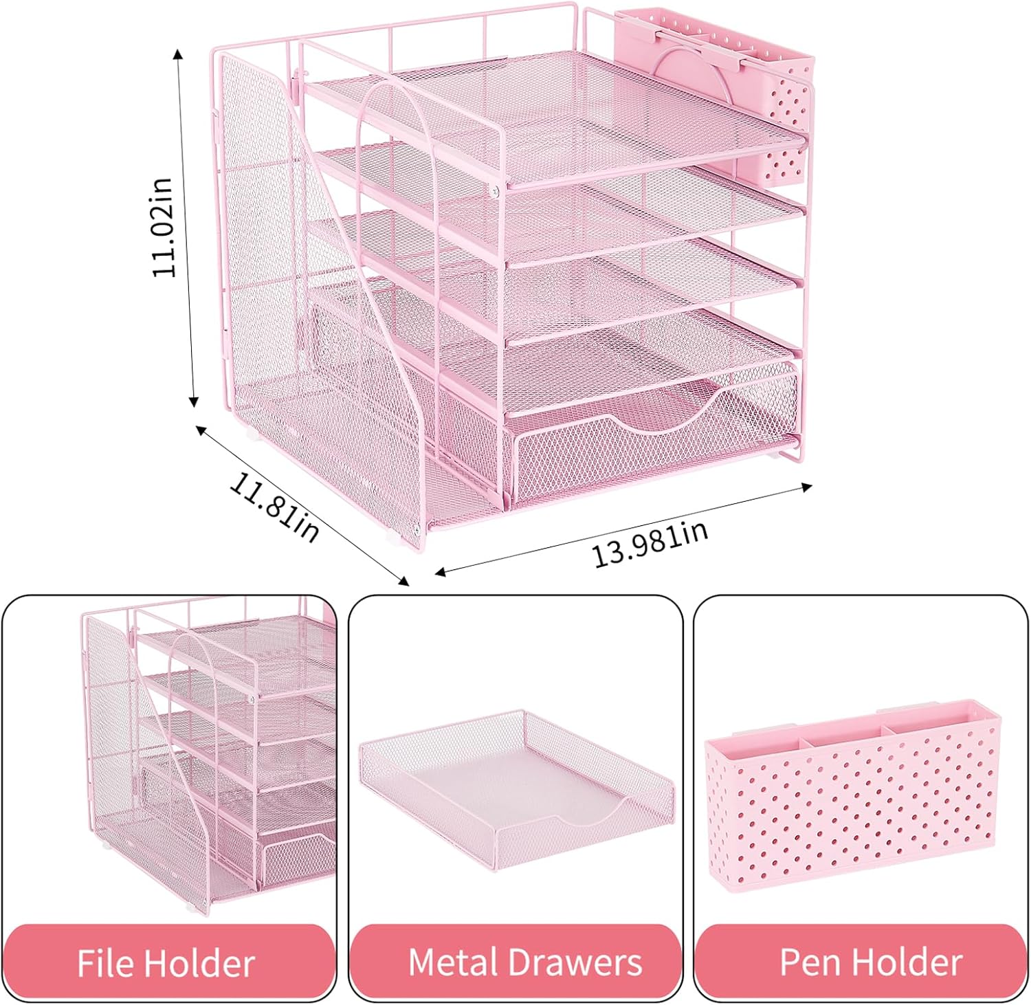 Desk Organizer with Drawer and Pen Holder, 5-Tier Paper Letter Tray Organizer with File Holder, Suitable for Workspace Organizer Office Supplies Storage (Pink)