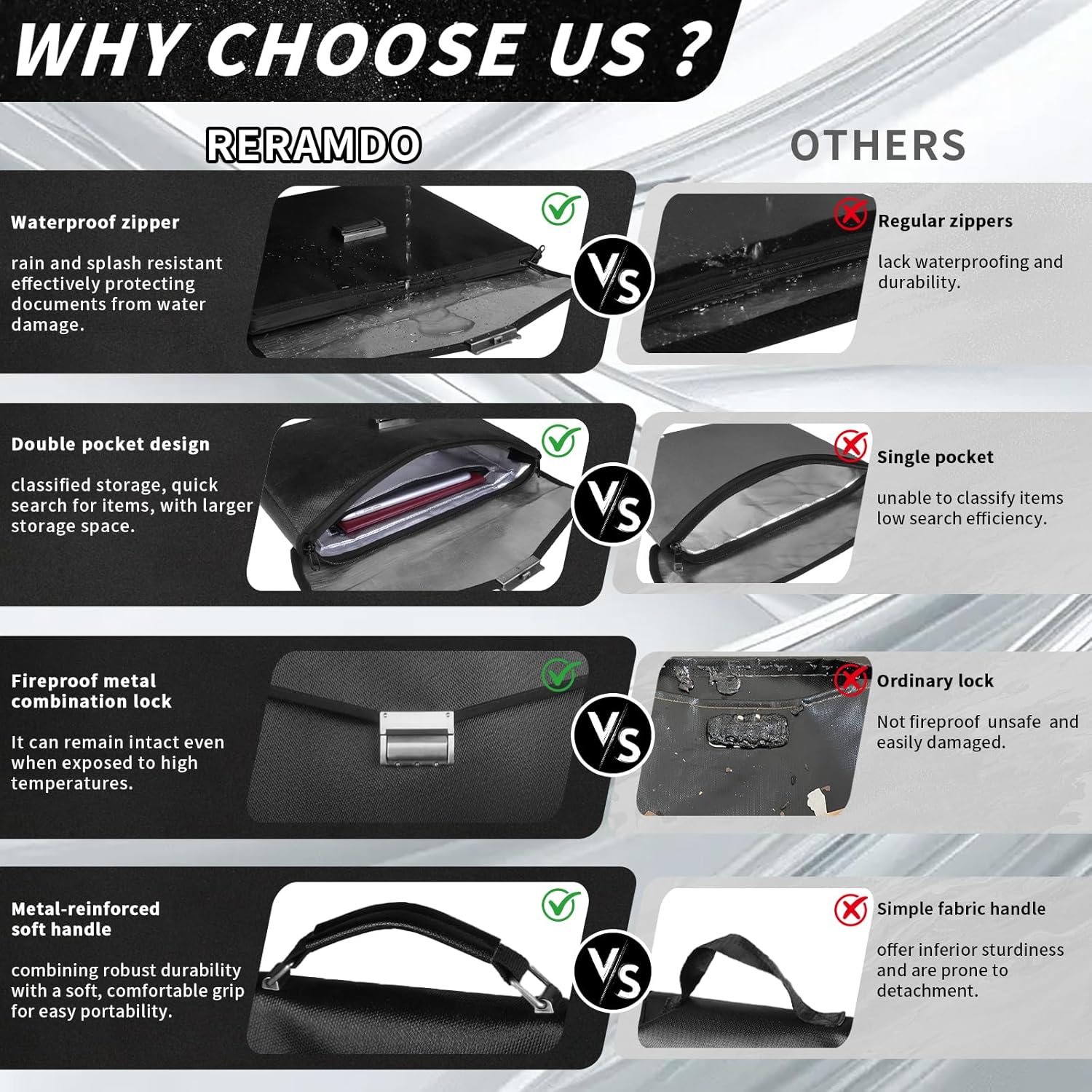 - [EXCELLENT FIRE&WATEPROOF PROPERTIES] RERAMDO upgraded fireproof document bag is made of 5-layer waterproof insulation, Material density increased by 37% Has Passed the global flammability standard and vertical combustion test (SGS UL94 V-0) Combined with special nesting design, it can withstand high temperatures up to 6400 °F The fireproof bag has independent spaces between each layer of material, so that the heat is continually weakened in dispersed transfer, ensuring the safety of valuables.