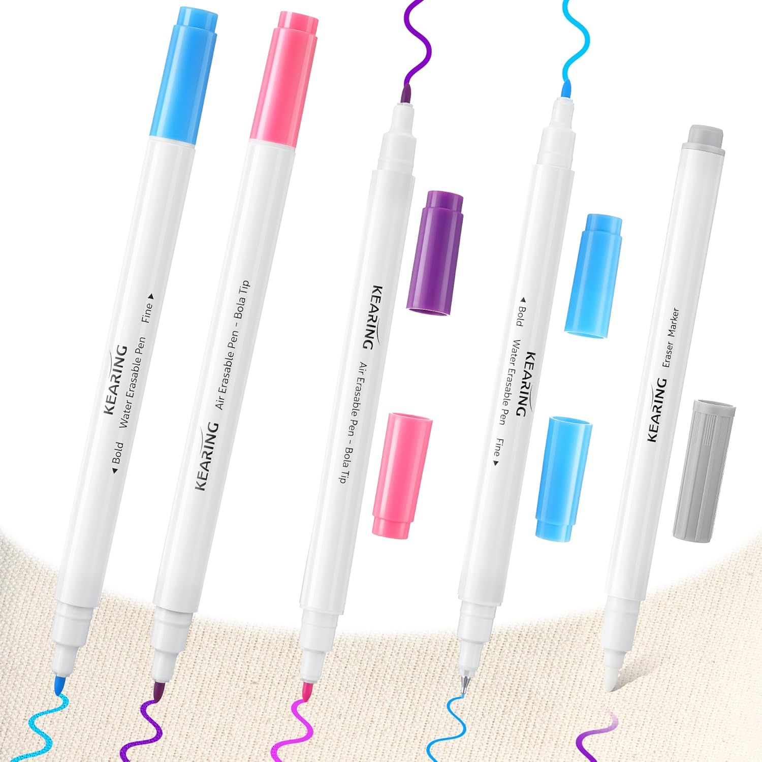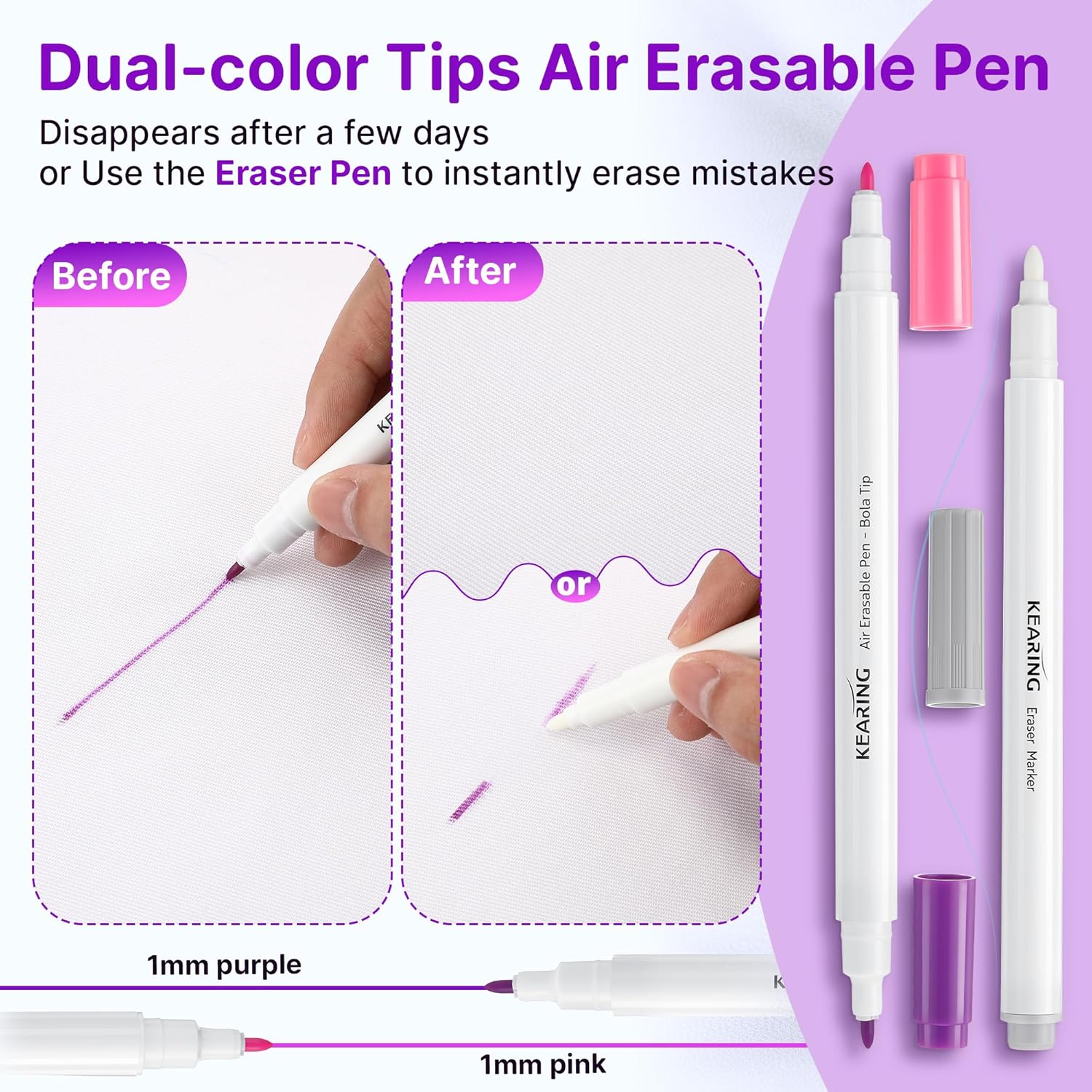 - Complete Set: This disappearing ink pen kit includes 2 dual tip water soluble pens(1mm + 0.5mm), 2 dual color tips air erasable pens(1mm pink + 1mm purple), and 1 eraser marker, which is perfect for various fabrics. Easily tackle any sewing task, making it an ideal gift for sewing and craft enthusiasts