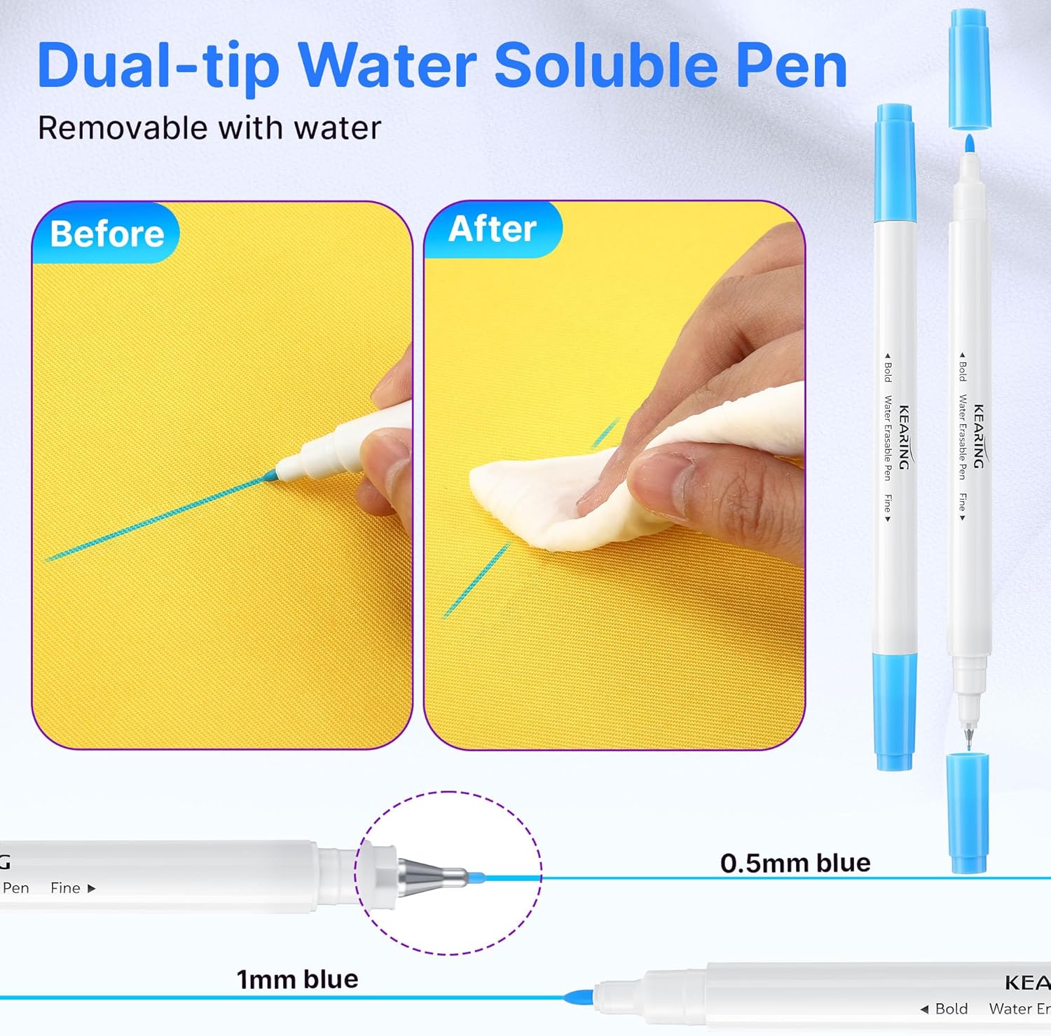 - Water Soluble: The water soluble pens work on washable fabrics. The fine tip draws precise lines for detailed markings, while the broad tip covers larger areas. Simply wipe with a damp cloth or rinse with water, no traces left behind