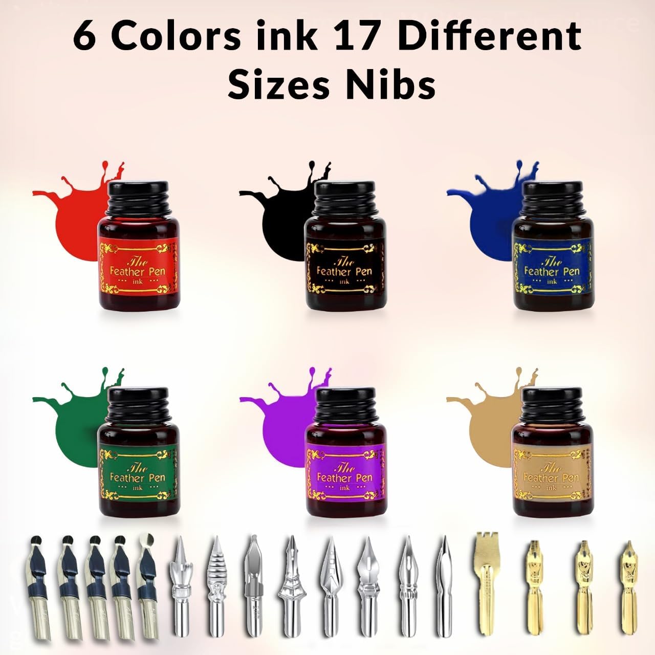 - INK COLLECTION: Includes 6 bottles of premium colored inks, a glass ink well, and a corked storage bottle for your writing supplies