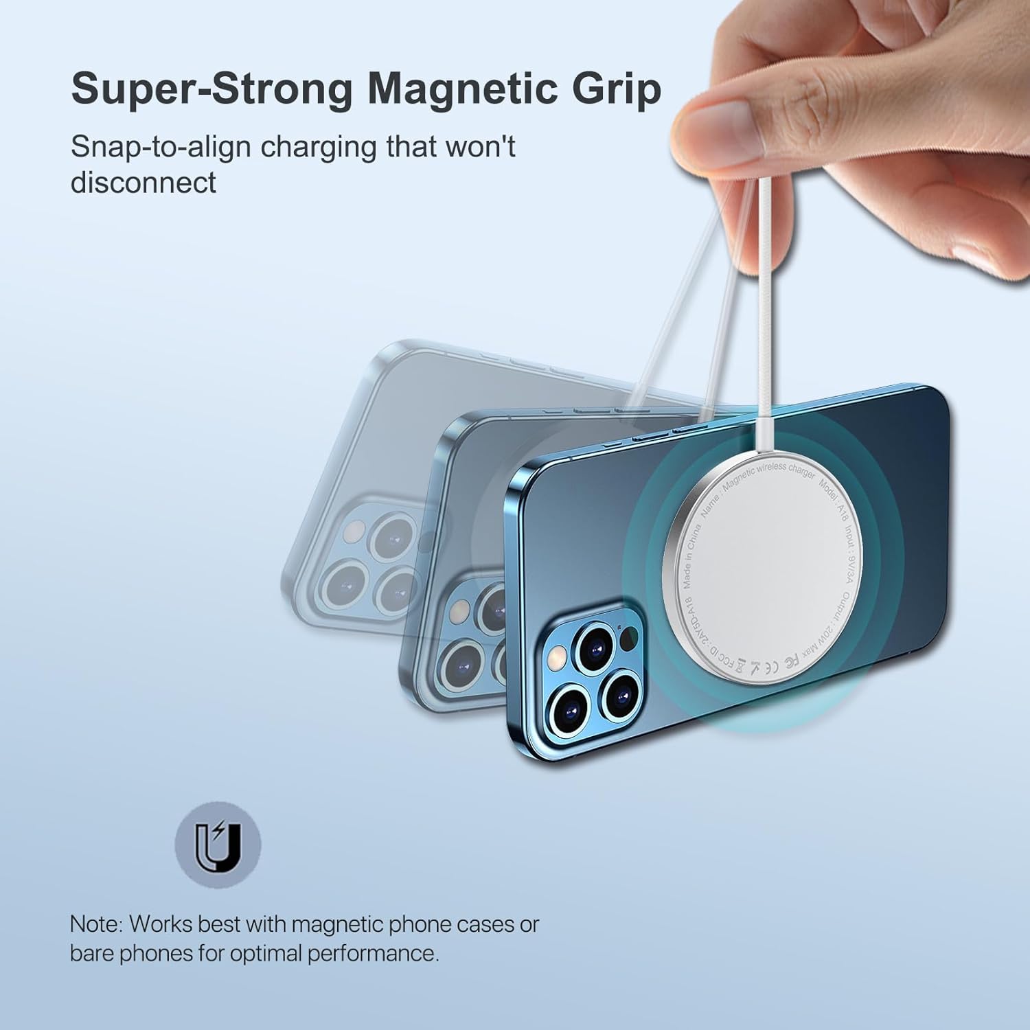 - ăStrong Magnetic Hold & 360° Chargingă this iphone magnetic charger provides a secure grip, preventing slips or misalignment. Enjoy 360° rotation for flexible charging in portrait or landscape mode. Works best with Mag-Safe cases (not included) for optimal magnetic strength.